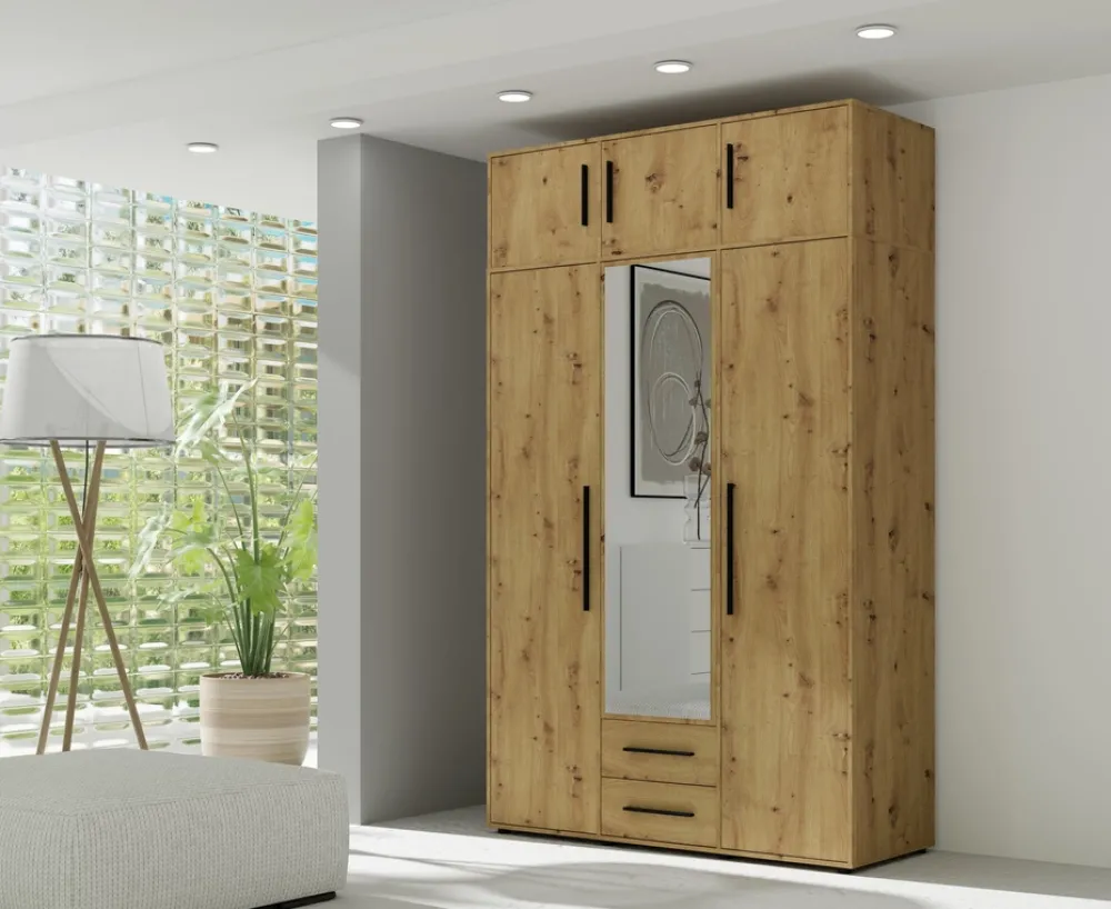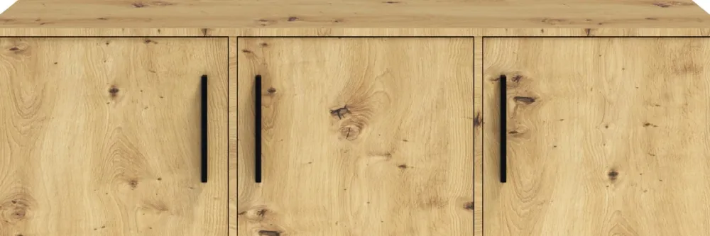 - Nadstawka MAXIDO w kolorze dębu artisan – idealne uzupełnienie szafy trzydrzwiowej, zapewniające dodatkowe miejsce do przechowywania. Trzy uchylne drzwi, solidna konstrukcja z płyty wiórowej 16 mm, czarne uchwyty, obrzeża ABS. Wymiary: 150x59x42,5 cm.