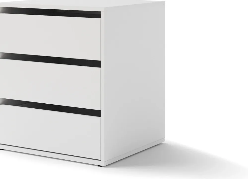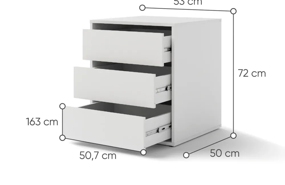 - Biały kontenerek do szafy przesuwnej MAXI posiada trzy przestronne szuflady idealne na drobiazgi i mniejsze przedmioty. Kontenerek nie posiada uchwytów, otwiera się poprzez złapanie za krawędź szuflady. Szuflady poruszają się na prowadnicach kulkowych.