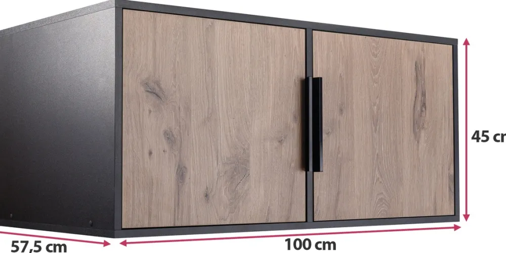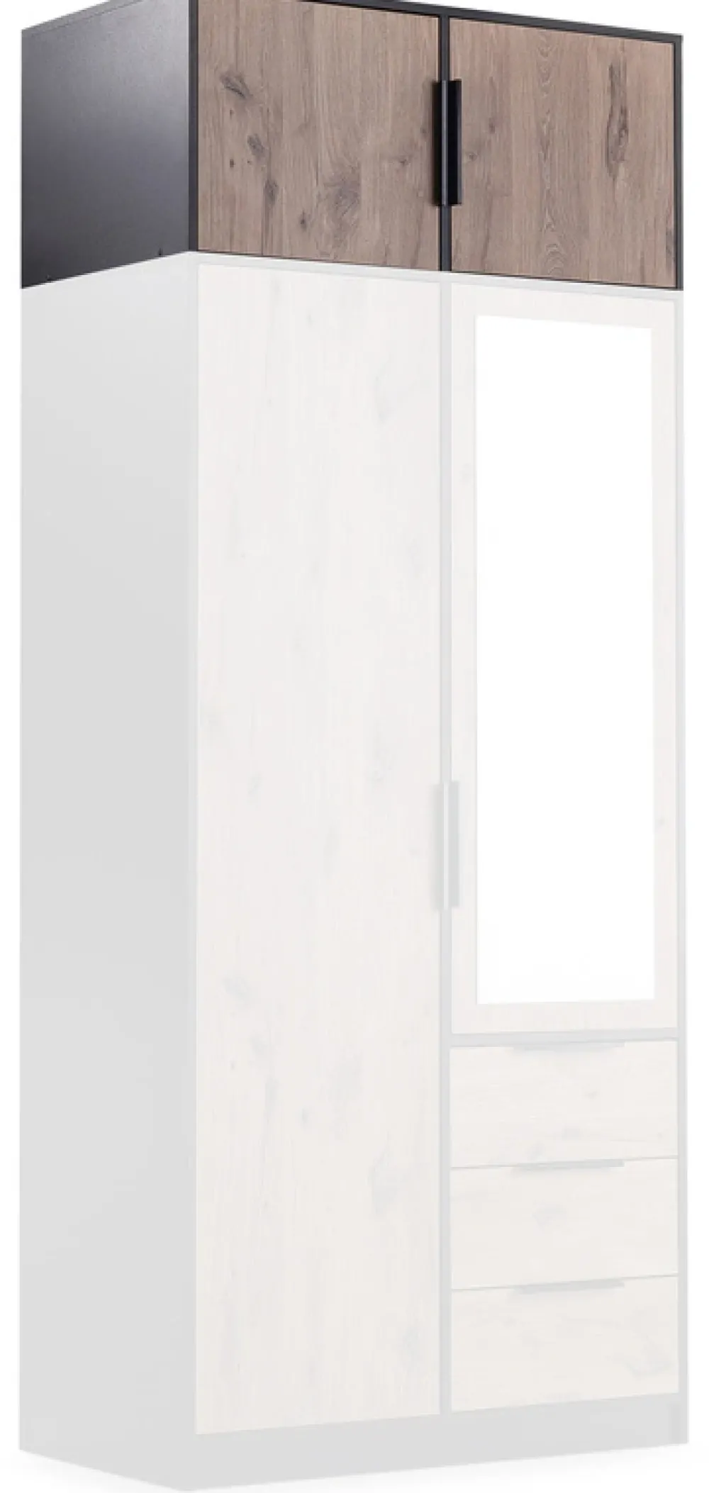 - Dwudrzwiowa nadstawka na szafę 100 cm LANTE posiada parę drzwi wzbogaconych o zawiasy z cichym domykiem, za którymi można przechować wiele akcesoriów i nie tylko. Nadstawka wykonana z płyty laminowanej 16 mm, uchwyty wykonano z aluminium.