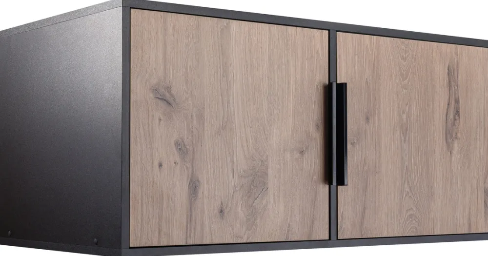 Czarne uchwyty nadstawki nadają jej nowoczesnego i eleganckiego charakteru, subtelnie kontrastując z powierzchnią mebla. Te stylowe detale podkreślają minimalistyczny wygląd i dodają całości nowoczesnego wyrazu, który wpasuje się w każde wnętrze.