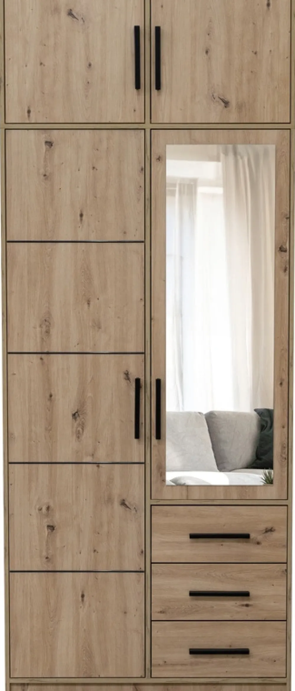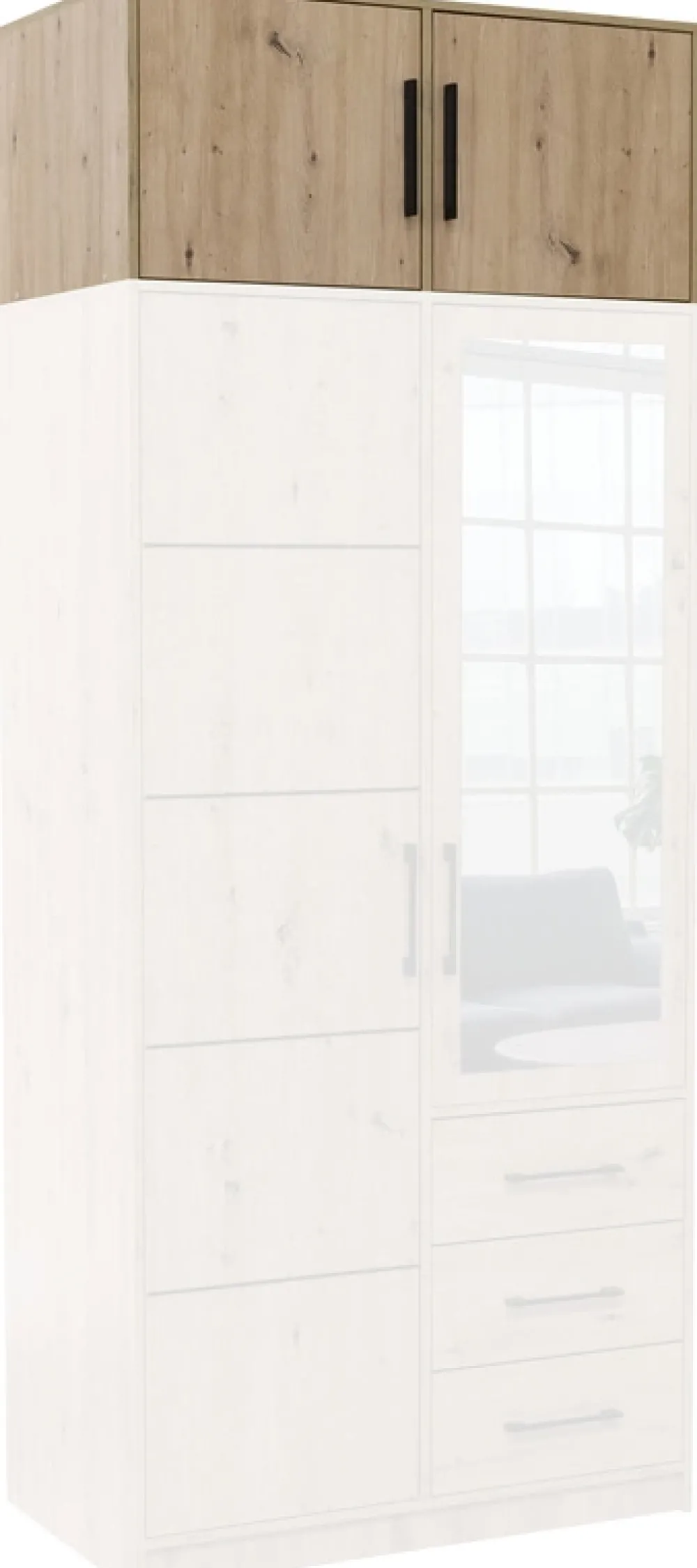 Czarne uchwyty nadają nadstawce eleganckiego, nowoczesnego charakteru, doskonale komponując się z różnymi stylami wnętrz. To subtelny detal, który dodaje meblowi wyrafinowanego wyglądu, jednocześnie pozostając praktycznym w codziennym użytkowaniu.