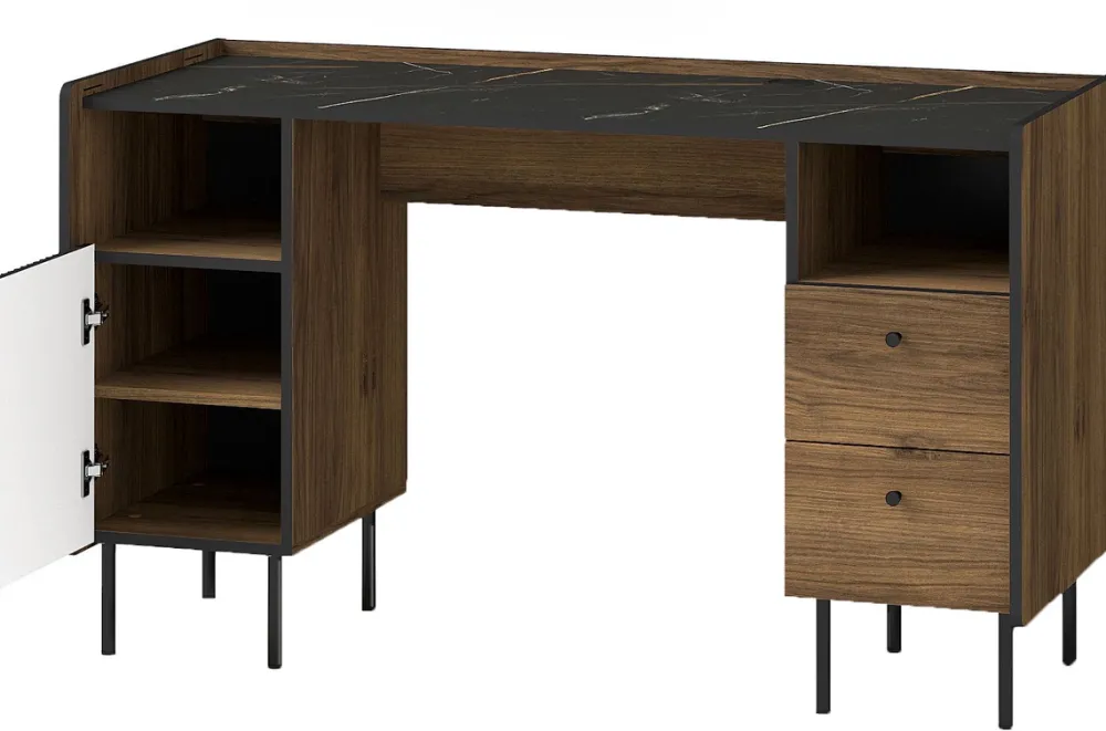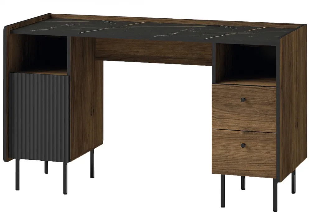 - Nowoczesne biurko PINNACLE z blatem o wymiarach 135×55 cm. Wyposażone w szafkę z jedną półką zamkniętą, dwie szuflady oraz dwie półki otwarte. Korpus i front szuflad wykonany z płyty laminowanej, a front ryflowany z płyty MDF. Nóżki wykonane z metalu.