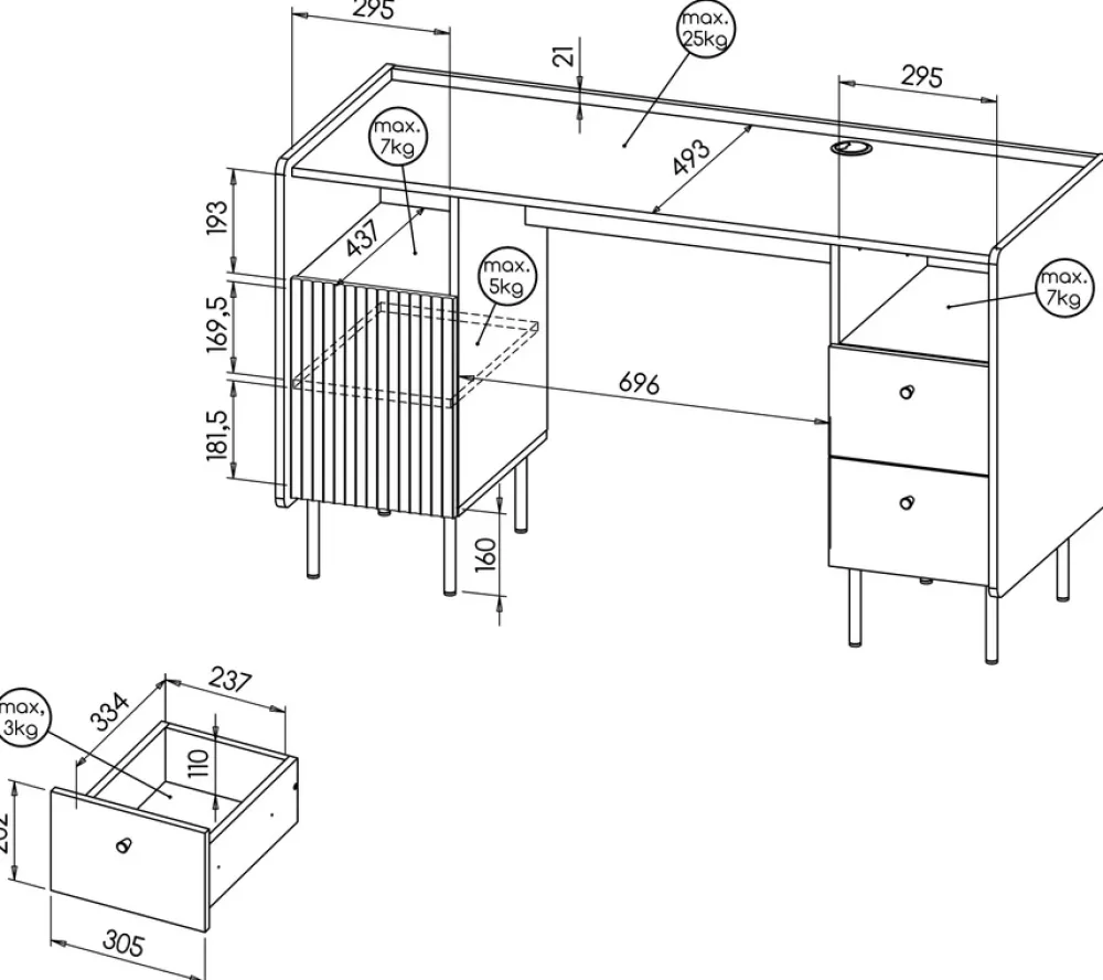Funkcjonalność biurka podkreślają detale takie jak ryflowany front, które nie tylko dodają charakteru, ale również ułatwiają otwieranie i zamykanie szafki. Solidna konstrukcja zapewnia stabilność, a jakość użytych materiałów gwarantuje długotrwałe użytkowanie. Biurko to jest więc nie tylko praktycznym, ale i estetycznym dodatkiem do każdego pomieszczenia, łączącym w sobie wygodę użytkowania z subtelnym designem.