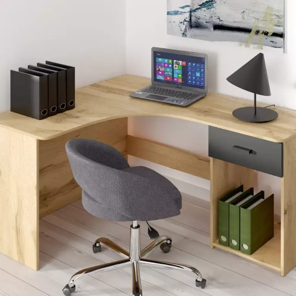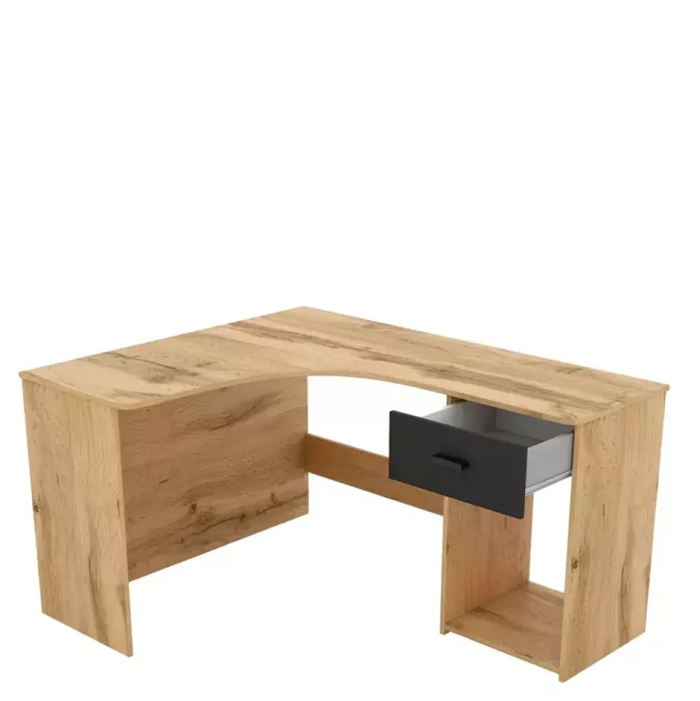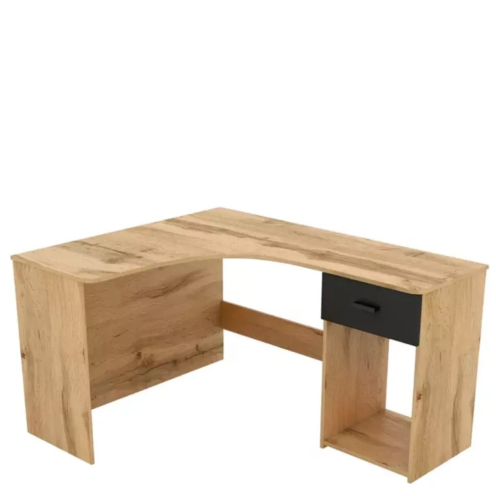 - Biurko narożne CALENIRE zostało wykonane w stonowanej oraz nowoczesnej stylistyce, dzięki której w doskonały sposób odnajduje się we współczesnych aranżacjach pomieszczeń. Posiada szufladę osadzoną na prowadnicach kulkowych z pełnym wysuwem.
