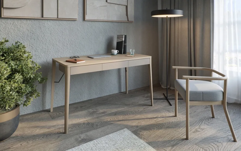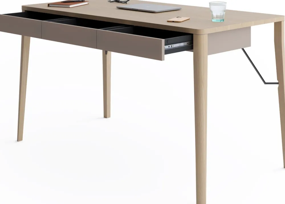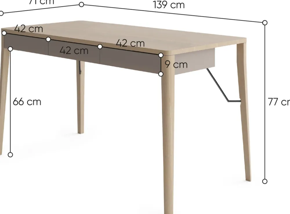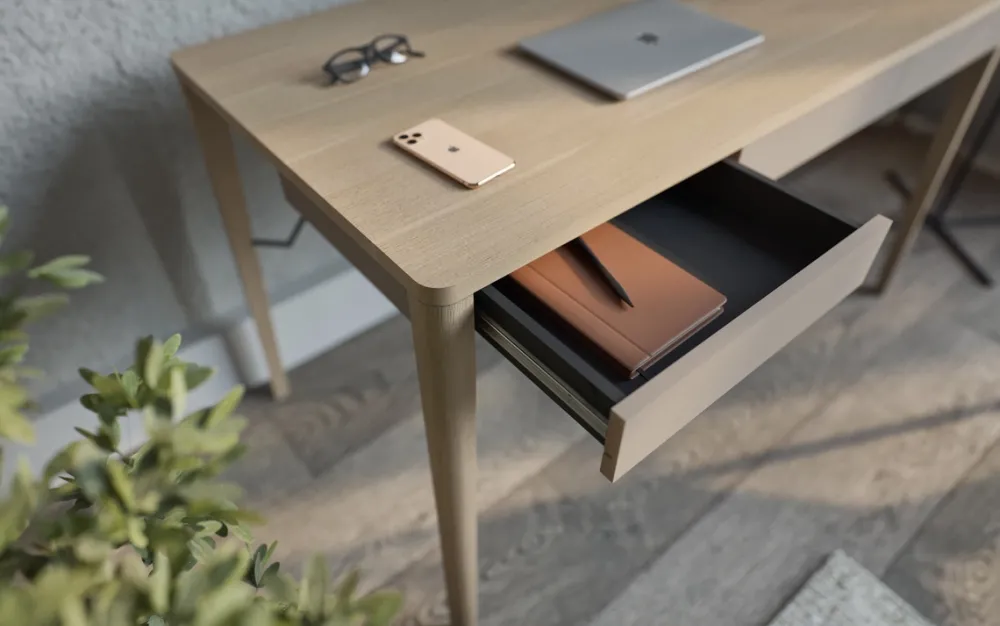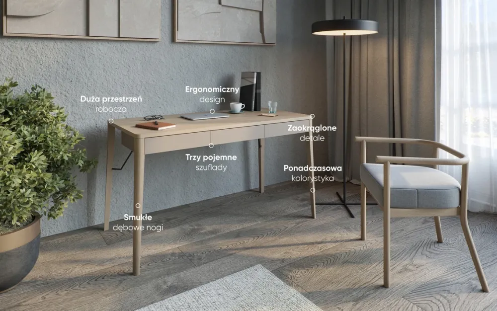 Wysokie nogi wykonane z drewna nadają całej konstrukcji lekkości i elegancji. Biurko zostało wyposażone w trzy przestronne szuflady, które poruszają się na prowadnicach kulkowych – zapewniając płynne i ciche otwieranie. Szuflady otwiera się poprzez złapanie za ich krawędź, co ułatwia dostęp do zawartości, jednocześnie zachowując minimalistyczny wygląd mebla.