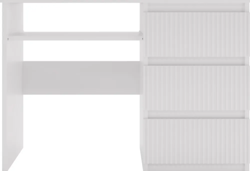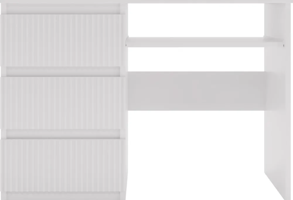 Biurko zostało wyposażone w trzy szuflady z frezowanymi frontami wykonanymi z płyty MDF, które nadają mu subtelny i stylowy charakter. Szuflady poruszają się na prowadnicach rolkowych, co gwarantuje ich płynne i ciche otwieranie. Idealne miejsce na dokumenty, przybory biurowe czy inne niezbędne przedmioty.