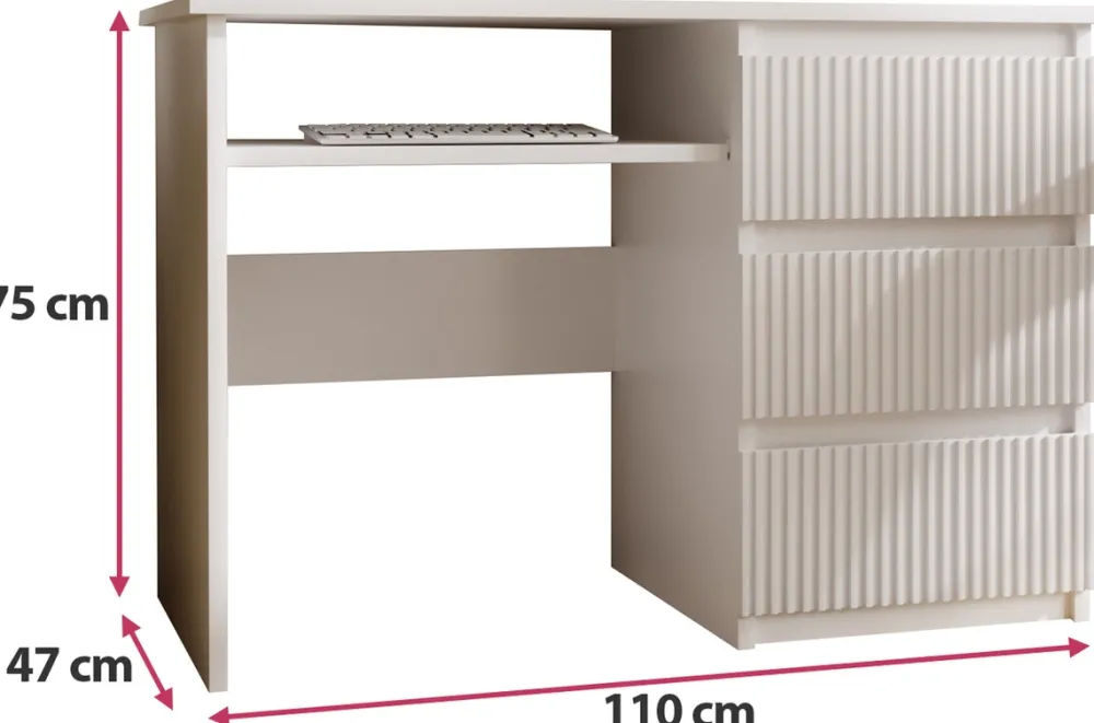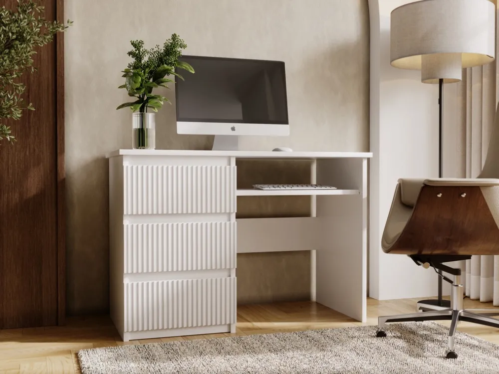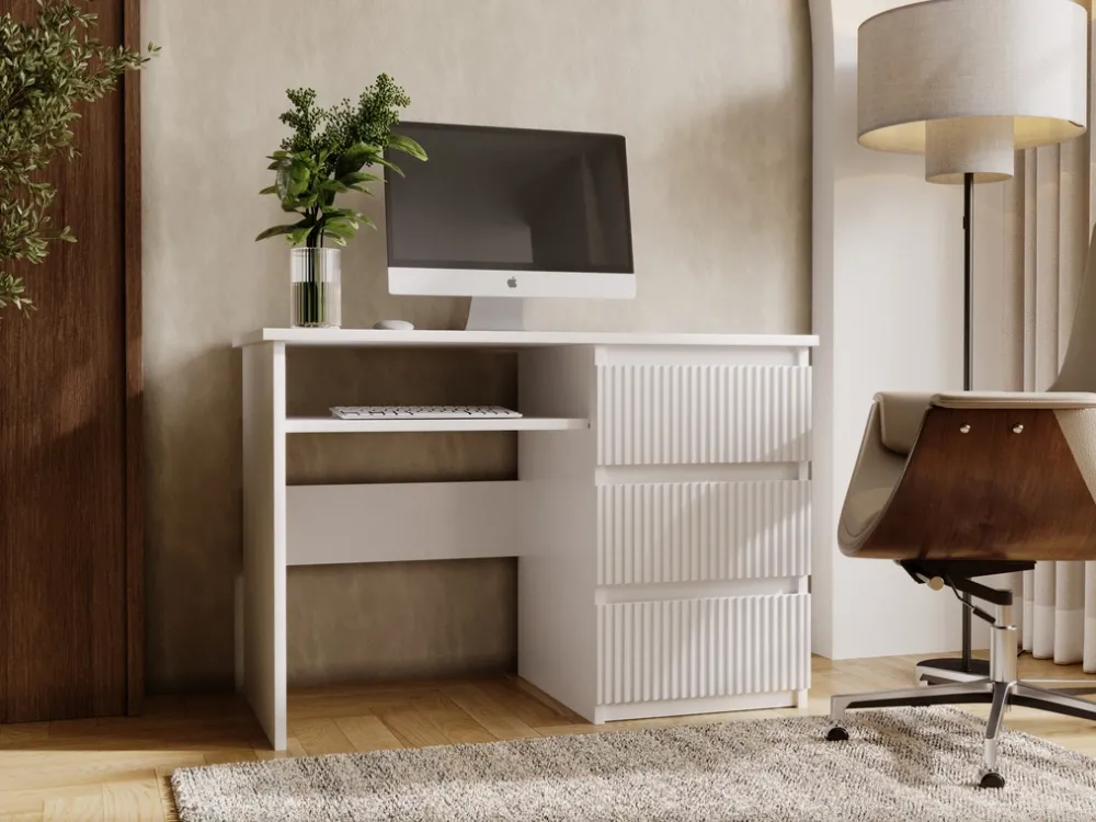 Biurko o szerokości 110 cm doskonale sprawdzi się w biurze, domowym gabinecie czy pokoju młodzieżowym. Połączenie frezowanych frontów z minimalistyczną formą sprawia, że wpisuje się zarówno w klasyczne, jak i nowoczesne aranżacje.