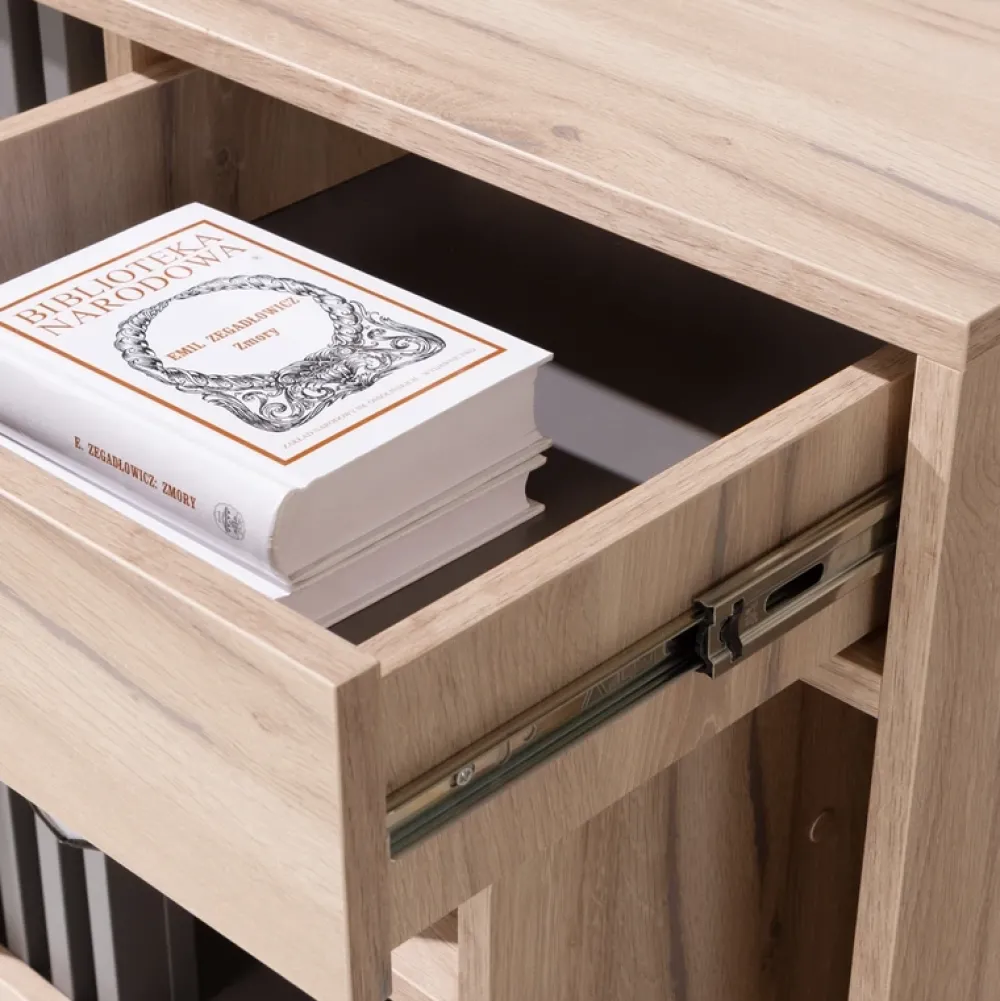 Jego funkcjonalność skrywa się w szerokim blacie, który z łatwością pomieści wszystkie niezbędne przedmioty do pracy czy nauki. Biurko posiada również jedną wnękę, idealną na przechowywanie dokumentów lub ulubionych książek, a także jedną szufladę z kulkową prowadnicą, która gwarantuje pełen wysuw, dzięki czemu masz łatwy dostęp do wszystkich przechowywanych w niej rzeczy.