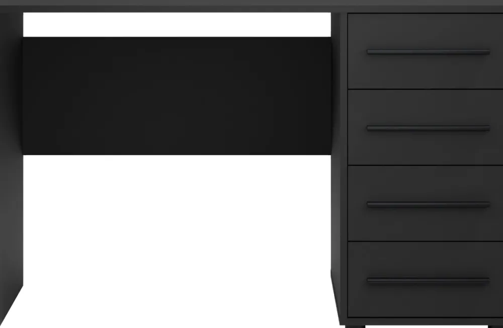 Biurko MAXIDO w klasycznej czerni to idealne rozwiązanie do domowego biura, pokoju młodzieżowego lub gabinetu. Prosta forma, czarne uchwyty i praktyczne szuflady tworzą mebel, który łączy nowoczesny wygląd z wysoką funkcjonalnością. Dzięki szerokiemu blatowi i czterem pojemnym szufladom bez trudu zorganizujesz przestrzeń do pracy czy nauki.