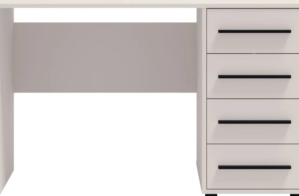 - Biurko MAXIDO kaszmir z szerokim blatem 120×60 cm i 4 szufladami. Płyta wiórowa, prowadnice kulkowe, uchwyty czarny mat. Wymiary: 120x75x60 cm. Nogi plastikowe, wysokość 2,5 cm. Obrzeże ABS. Samodzielny montaż. Idealne do biura i pokoju młodzieżowego.
