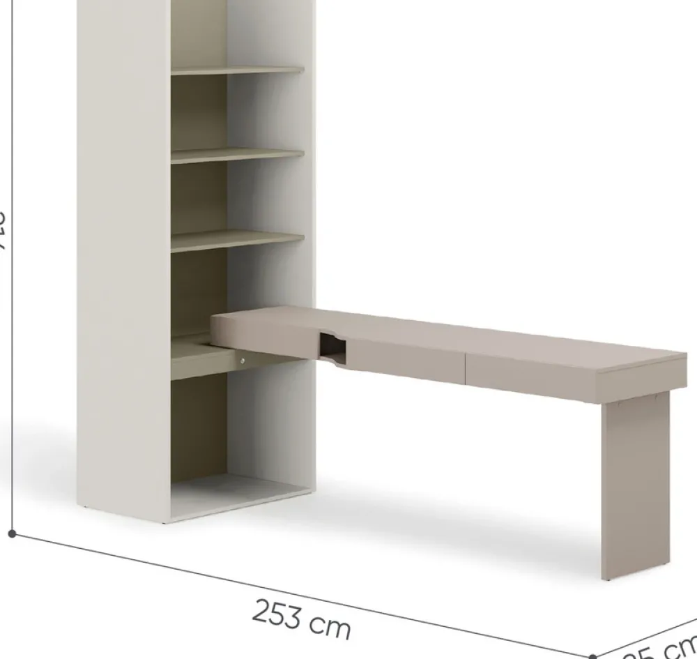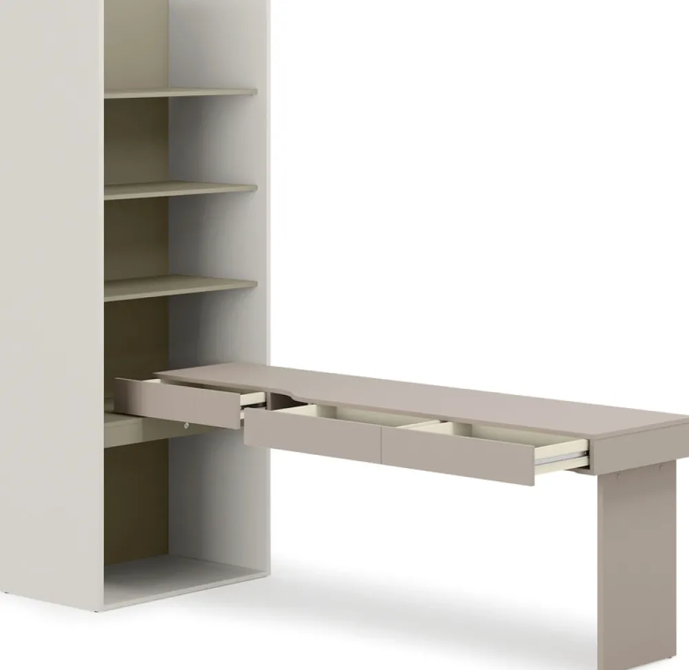 - Zestaw WOOW z biurkiem prawym i regałem w kolorach szampański, eukaliptus i clay grey to idealne rozwiązanie do pokoju młodzieżowego. Trzy szuflady i pięć półek oferują przestrzeń do nauki i przechowywania, nawet w niewielkich wnętrzach.