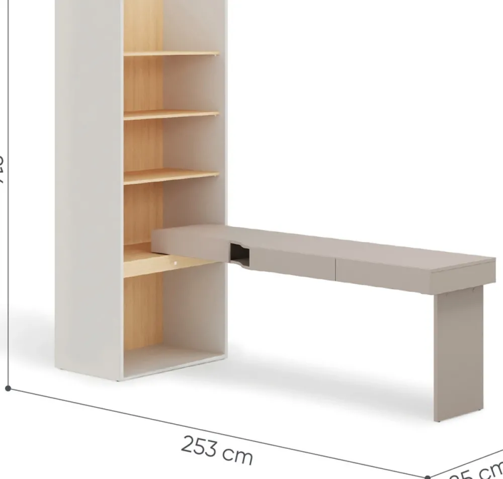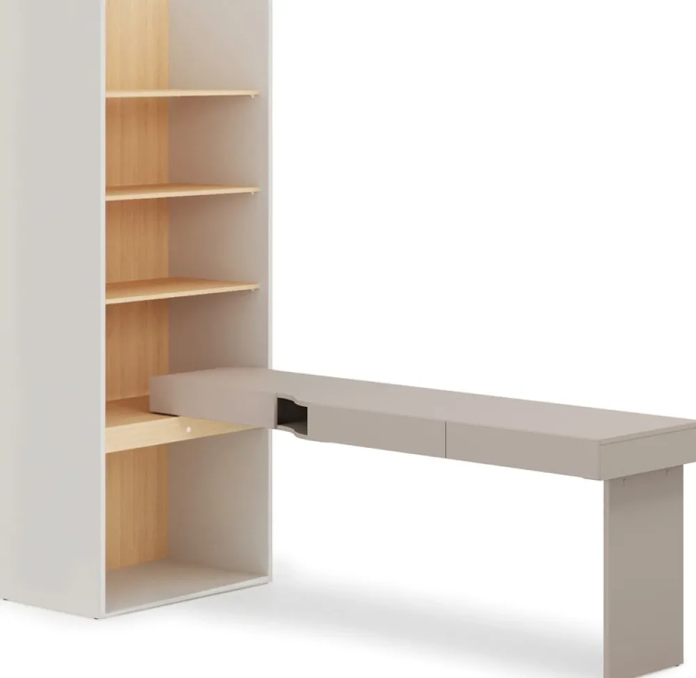 - Zestaw WOOW z biurkiem prawym i regałem w kolorach szampański, dąb vincenza i clay grey to idealne rozwiązanie do pokoju młodzieżowego. Trzy szuflady i pięć półek oferują przestrzeń do nauki i przechowywania, nawet w niewielkich wnętrzach.
