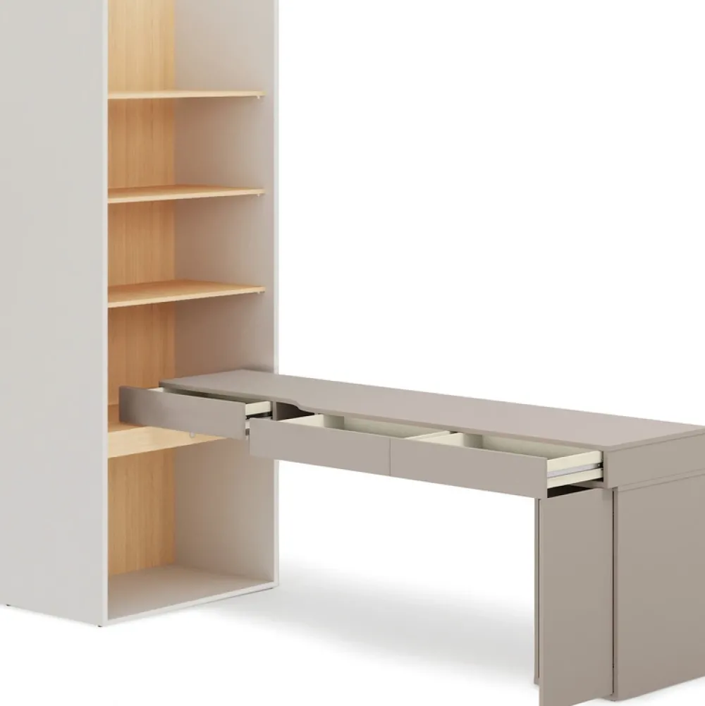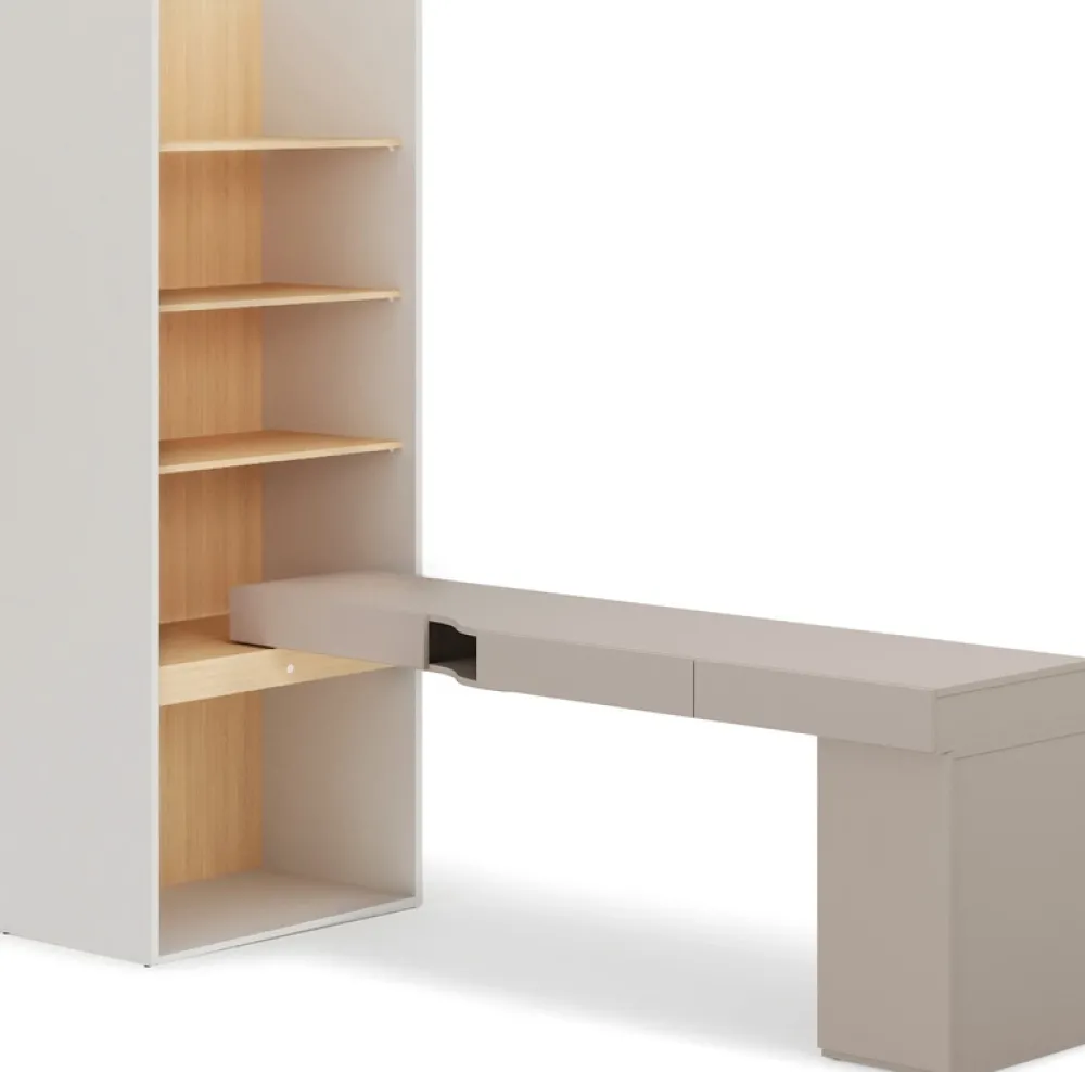 Zestaw WOOW to propozycja dla młodych ludzi, którzy cenią sobie przestrzeń do nauki, kreatywnej pracy i przechowywania w estetycznym otoczeniu. Ergonomiczne rozmieszczenie biurka, szerokiego regału i kontenerka tworzy spójną, funkcjonalną całość, która rośnie wraz z potrzebami użytkownika. Dzięki ponad 3 metrom szerokości i ponad 2 metrom wysokości, mebel zapewnia maksimum przestrzeni bez konieczności rozbudowywania wnętrza.