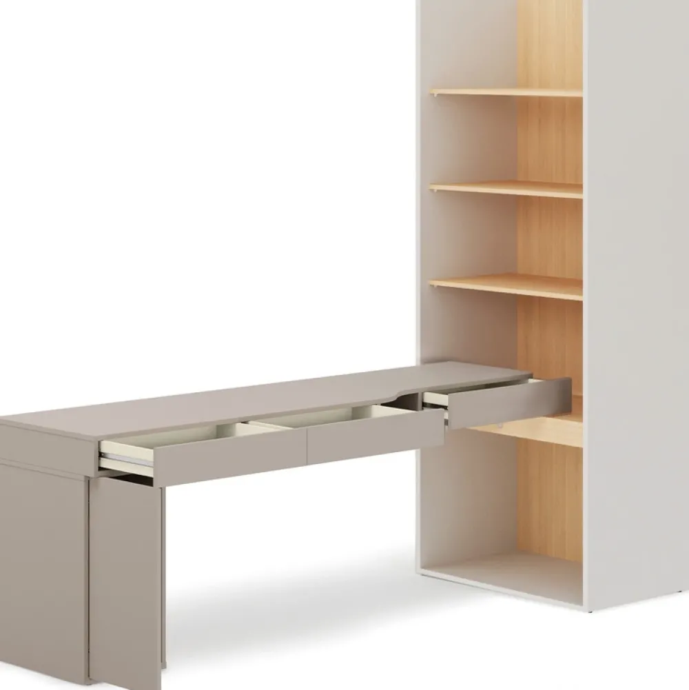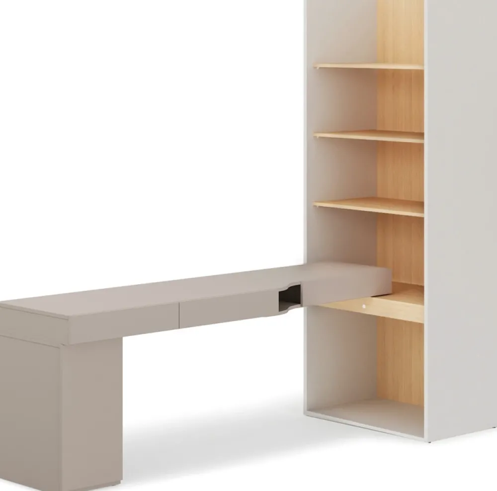 - Biurko lewostronne WOOW z regałem i kontenerkiem w kolorach szampański, clay gray i dąb Vincenza to nowoczesny zestaw do pokoju młodzieżowego. Aż 7 półek i 3 szuflady zapewniają komfortową przestrzeń do nauki, przechowywania i codziennej organizacji.