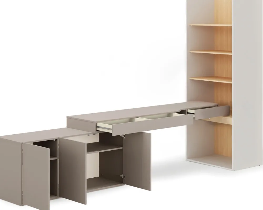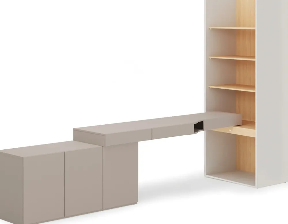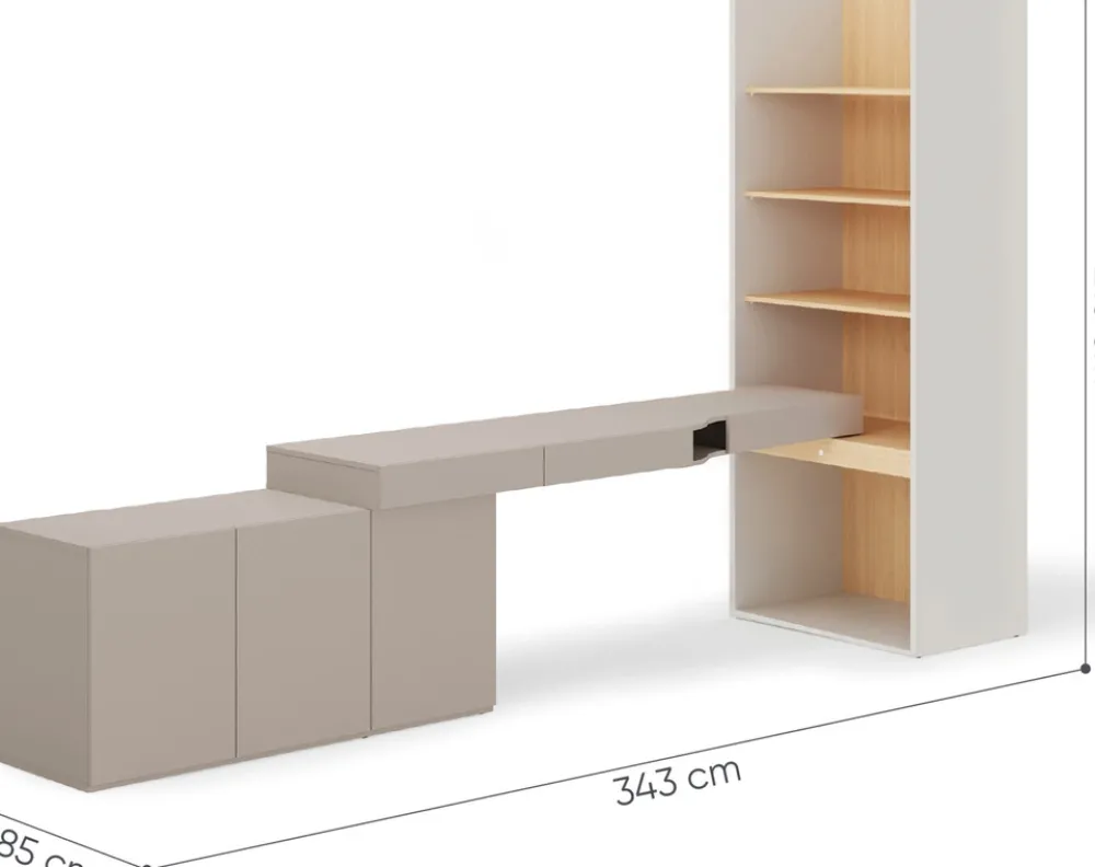 - Zestaw mebli z biurkiem lewym, komodą i regałem w kolorze szampańskim, dąb vincenza i clay gray to nowoczesne wyposażenie pokoju nastolatka. Duży blat i pojemne półki zapewniają funkcjonalność, wygodę i stylową przestrzeń do nauki i przechowywania.