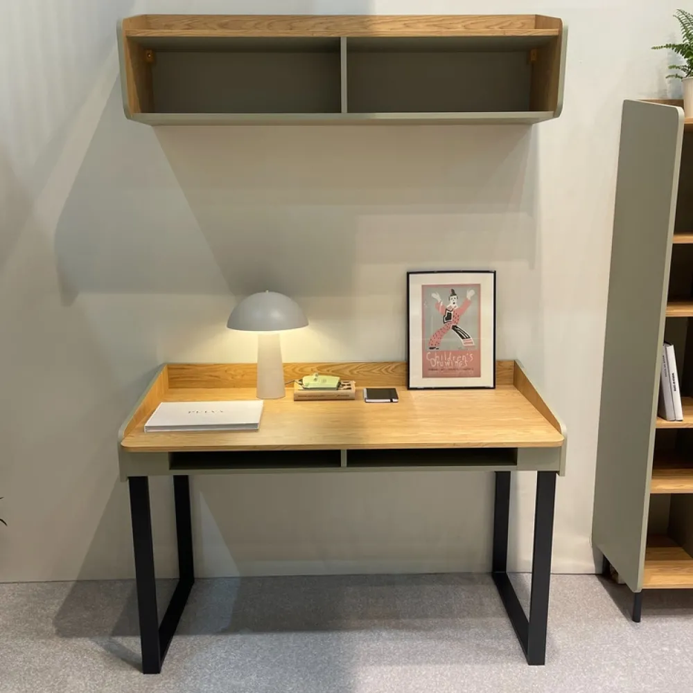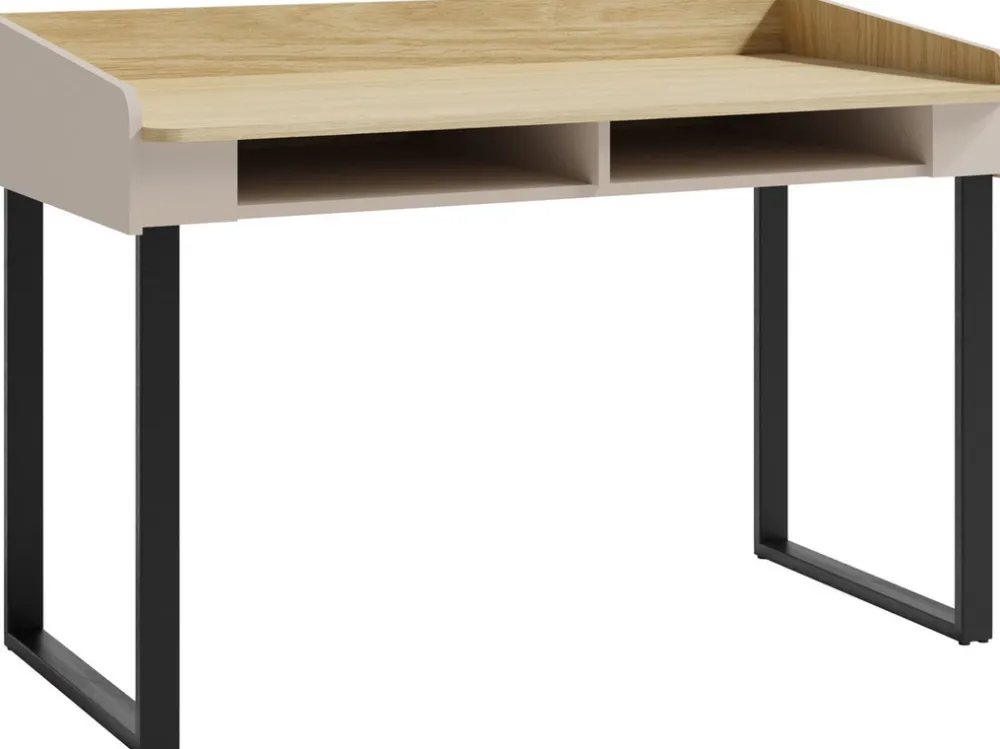 - Młodzieżowe biurko ALDENO o szerokości 125 cm w kolorze beż piaskowy + dąb olejowany. Wyposażone zostało w wysokie metalowe nogi oraz dwie otwarte półki, idealne na różne akcesoria i drobiazgi. Młodzieżowe biurko posiada obrzeża zabezpieczone okleiną ABS.