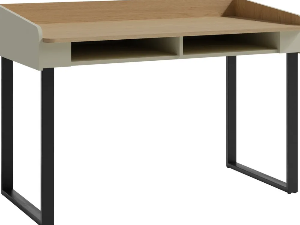 - Młodzieżowe biurko ALDENO o szerokości 125 cm w kolorze eukaliptus + dąb baltic dune. Wyposażone zostało w wysokie metalowe nogi oraz dwie otwarte półki, idealne na różne akcesoria i drobiazgi. Młodzieżowe biurko posiada obrzeża zabezpieczone okleiną ABS.