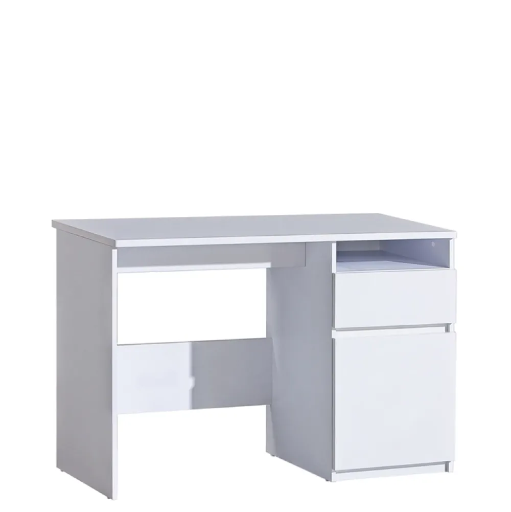 Białe biurko z szufladą prezentuje się w eleganckim białym kolorze, który doda świeżości i lekkości do każdego pokoju młodzieżowego. Dzięki swojej uniwersalnej kolorystyce, z łatwością wpasuje się w każdą paletę kolorów. Obrzeża zabezpieczone okleiną PCV zapewniają wytrzymałość i odporność na uderzenia, gwarantując, że biurko będzie służyć przez wiele lat.