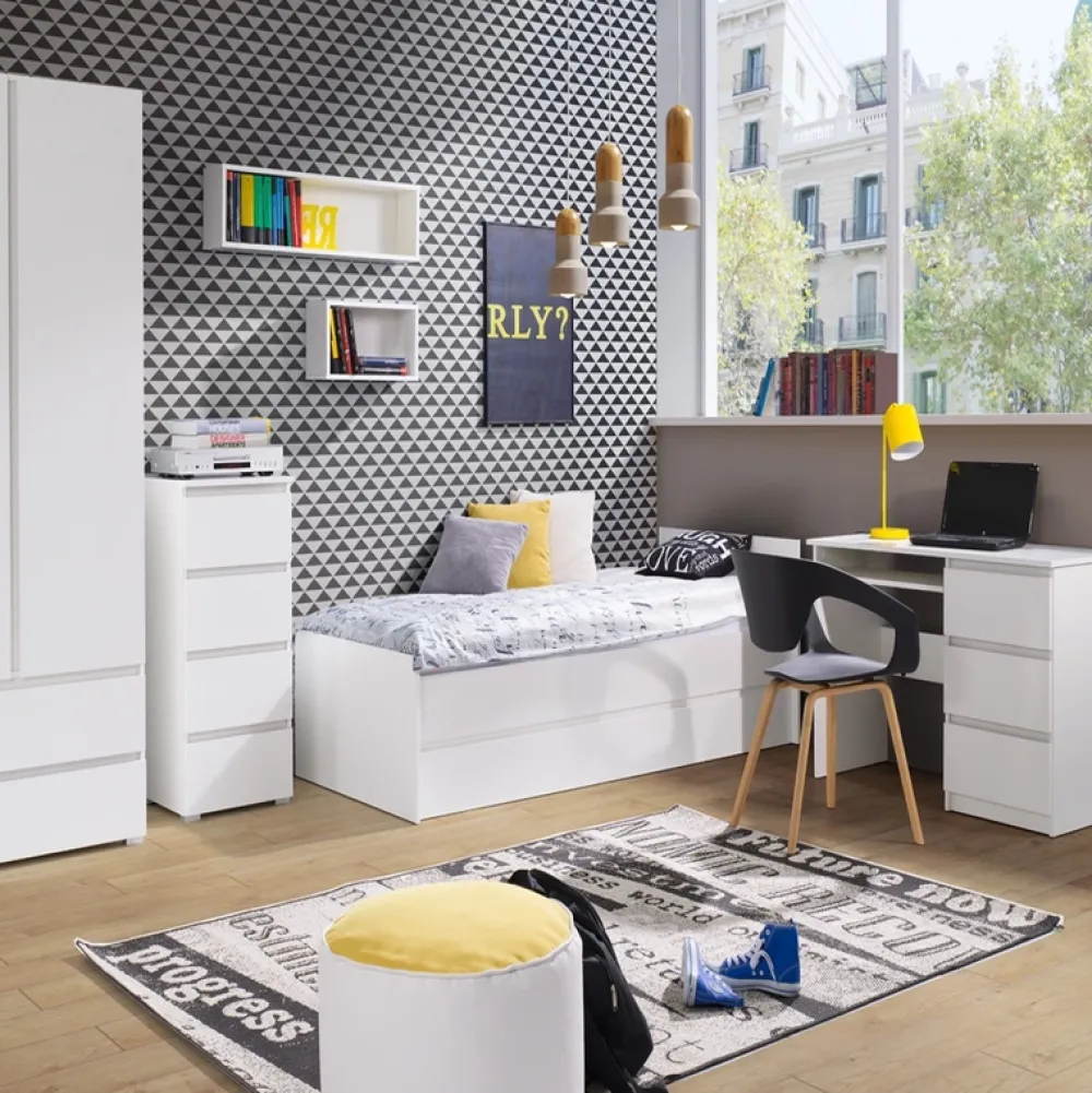 Oto biurko młodzieżowe COSTA, które przekształca codzienną naukę i twórczość w prawdziwą przyjemność. Wykonane z wytrzymałej, 16 mm płyty laminowanej w niewinnej bieli, dodaje świeżego, nowoczesnego akcentu do każdego pokoju młodzieżowego.