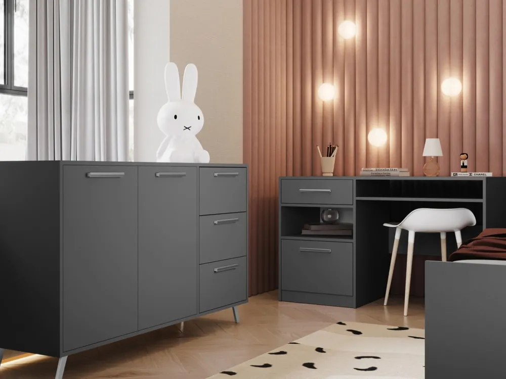 Biurko młodzieżowe BILL łączy funkcjonalność z nowoczesnym designem, doskonale pasując do pokoju nastolatka. Szerokość 125 cm sprawia, że biurko oferuje wystarczającą przestrzeń roboczą, idealną do nauki, pracy przy komputerze, czy realizacji twórczych projektów.