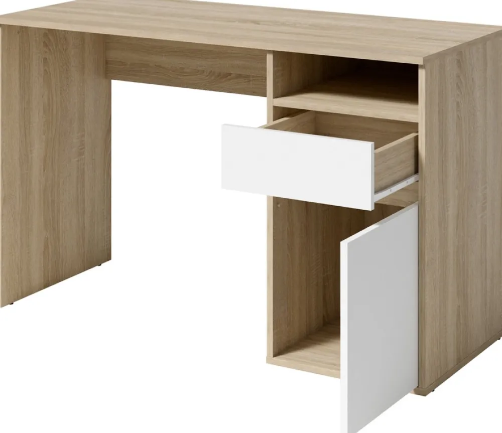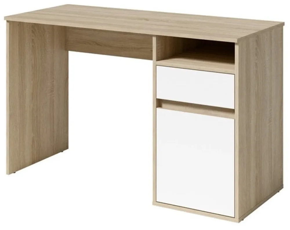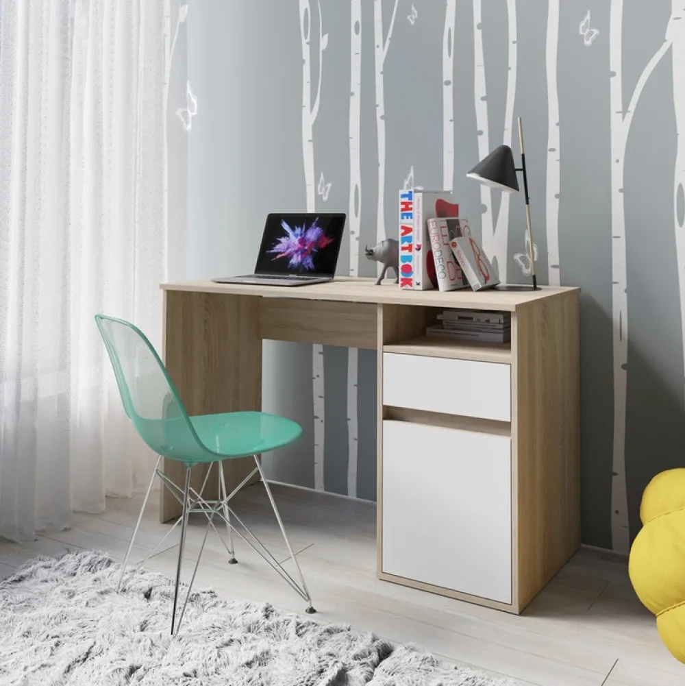 - Biurko młodzieżowe BILLY dąb sonoma/biały 120 cm – połączenie naturalnego korpusu z jasnym frontem. Z szufladą i półką pod blatem. Idealne do pokoju dziecka lub domowego biura. Praktyczny wybór łączący funkcjonalność, estetykę i wygodę na co dzień.