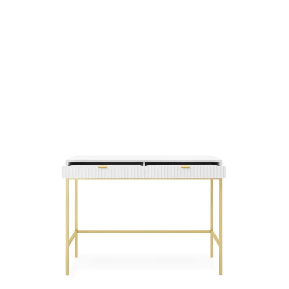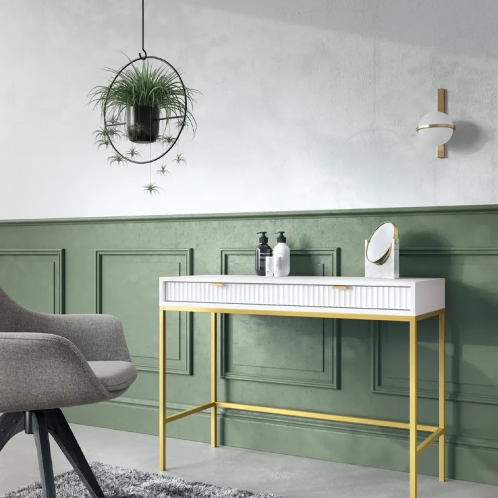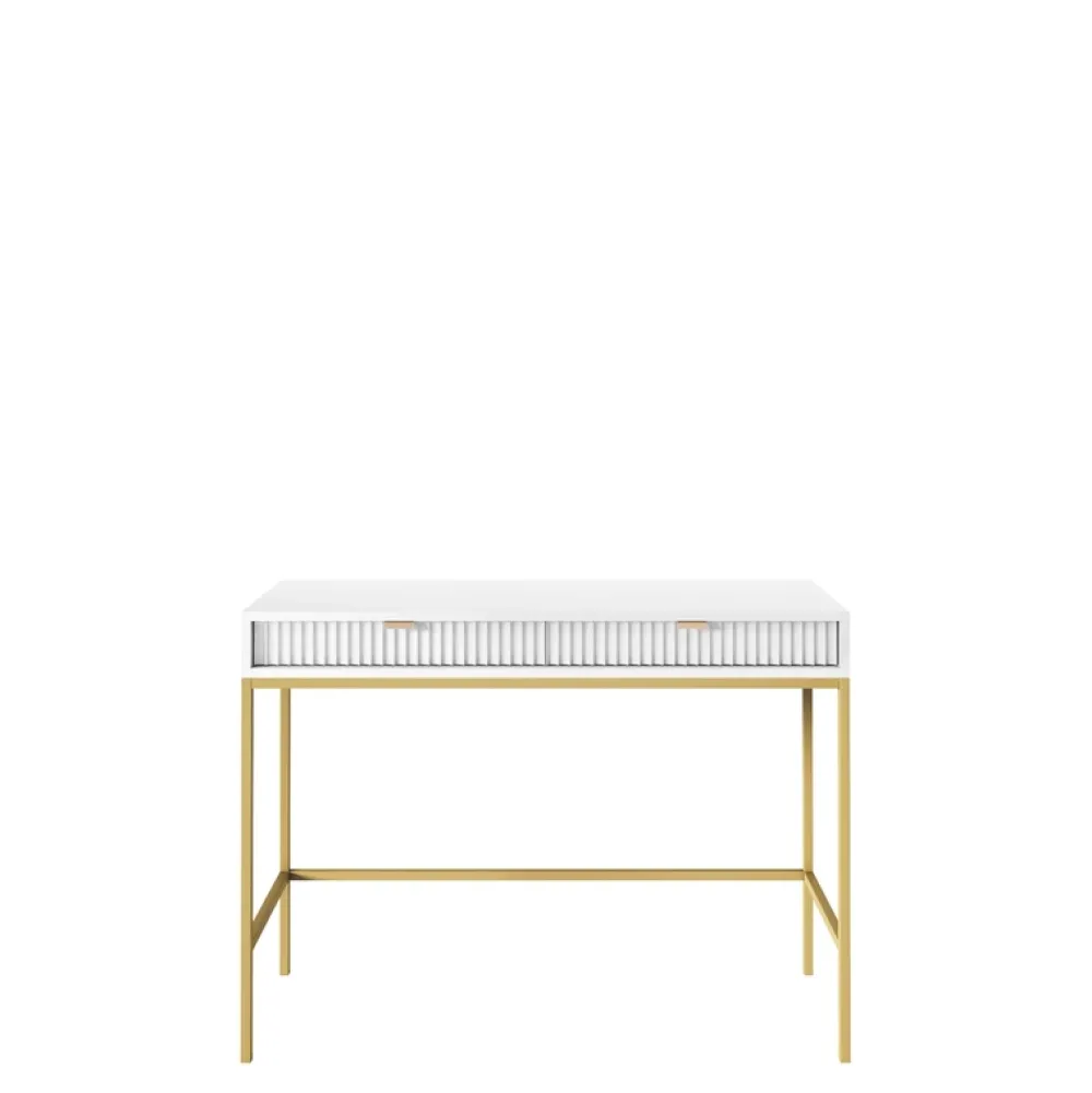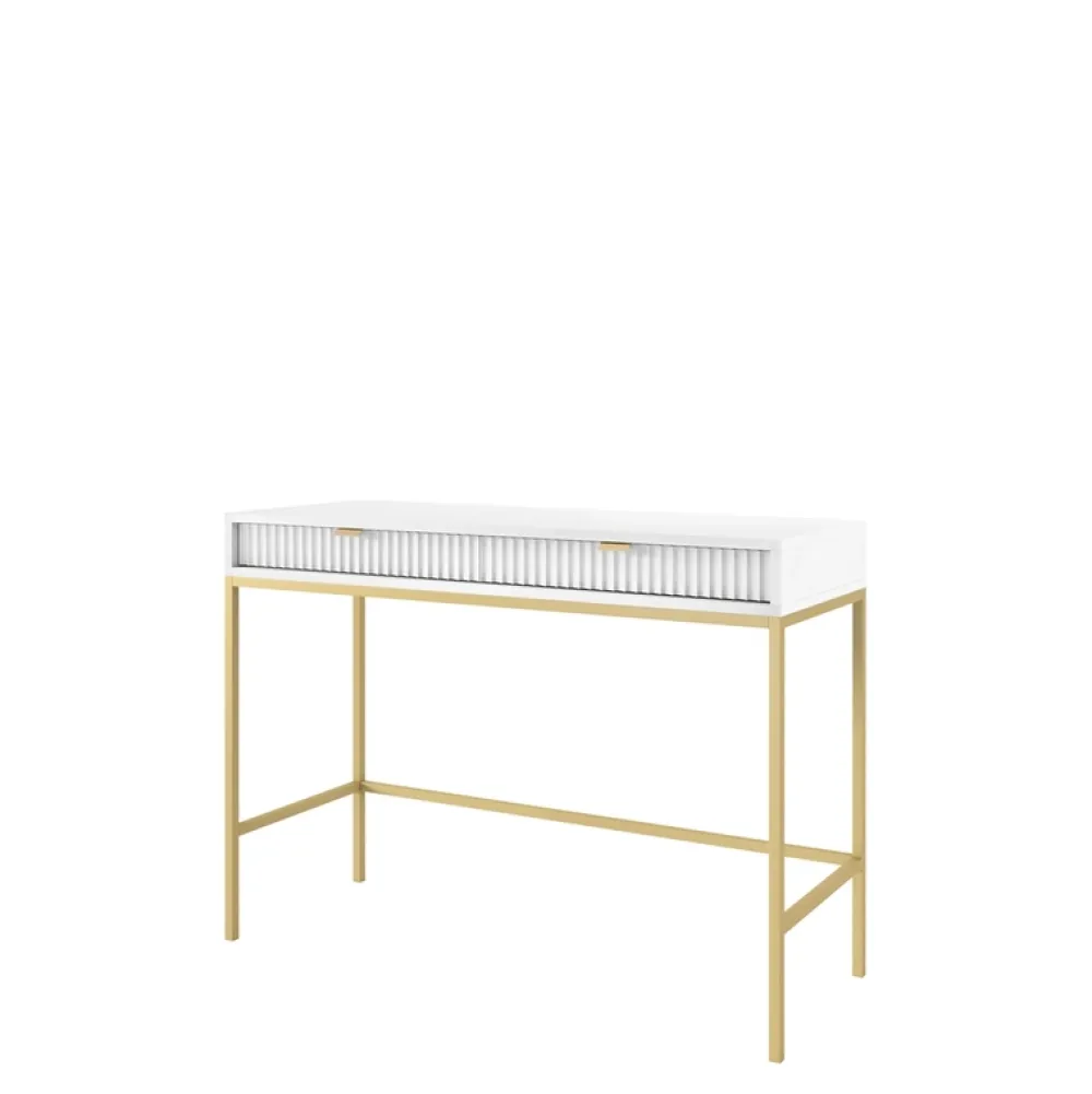 - Biała toaletka AVANTI w stylu glamour. Korpus i ryflowane fronty MDF tworzą harmonijną całość. Wysokie, złote nogi dodają elegancji. Praktyczne dwie szuflady na Twoje ulubione kosmetyki.