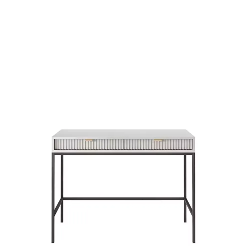 Praktyczna i funkcjonalna toaletka AVANTI posiada dwie szuflady o wysokości 8 cm. Szuflady z ryflowanymi frontami wzbogacono o złote uchwyty, dzięki czemu będziesz mieć łatwy dostęp do znajdujących się wewnątrz kosmetyków. Mebel osadzono na wysokim, czarnym stelażu metalowym, który jest tak skonstruowany, aby użytkownik miał jak największą przestrzeń na nogi lub na krzesło, które dostawisz do toaletki.