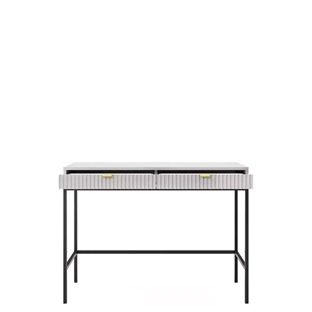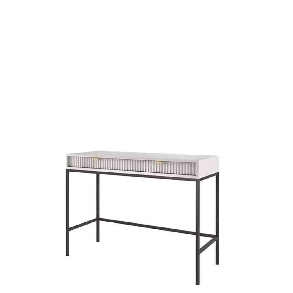 - Szara toaletka AVANTI posłuży jako miejsce na kosmetyki lub jako biurko, czy konsola w przedpokoju. Blat o wymiarach 104×50 cm, szuflady z ryflowanymi frontami i złote uchwyty czynią ten mebel praktycznym i funkcjonalnym.