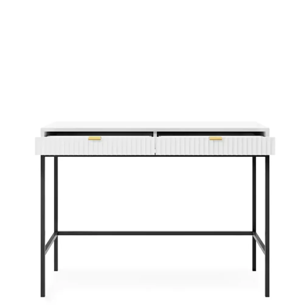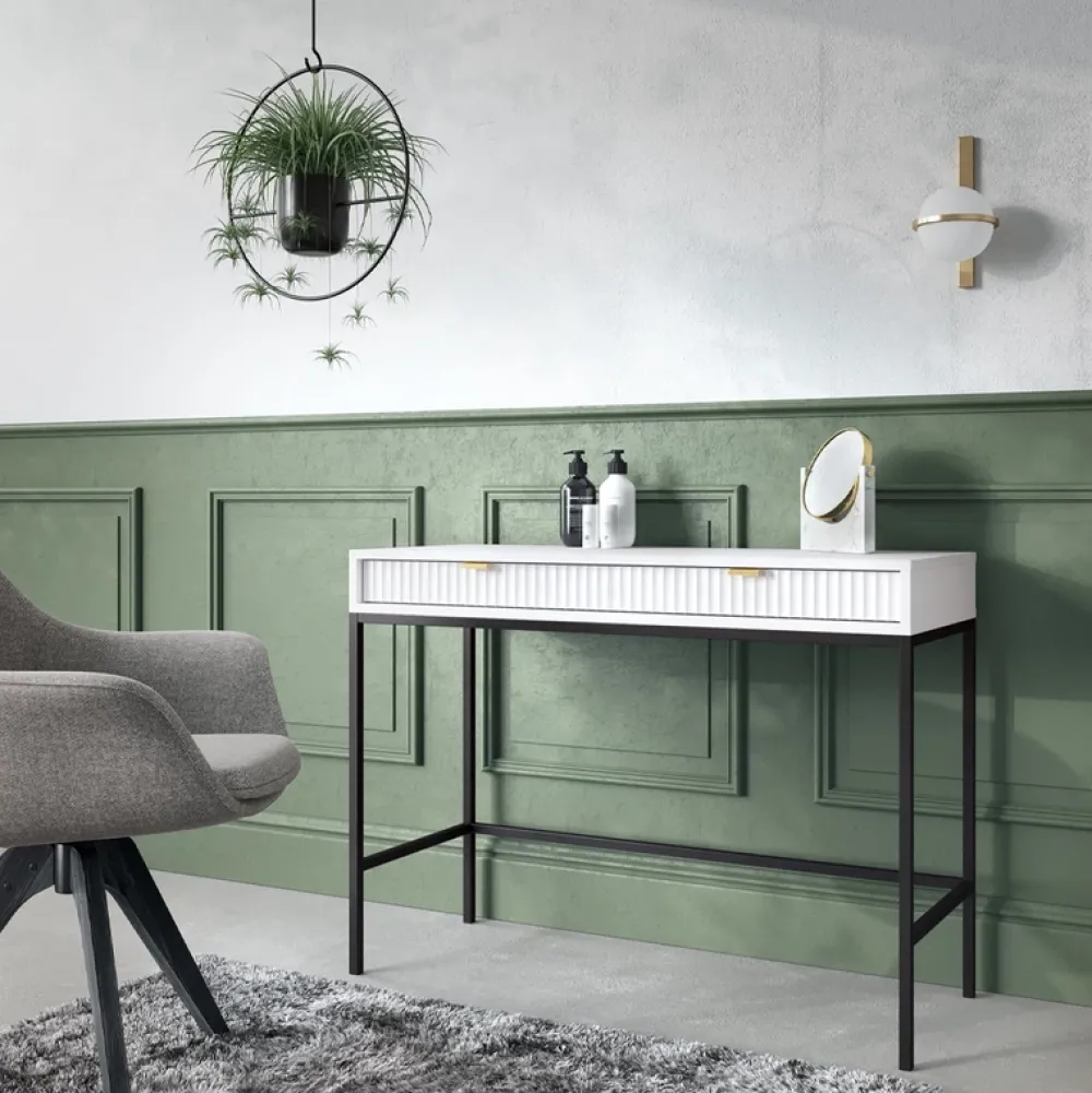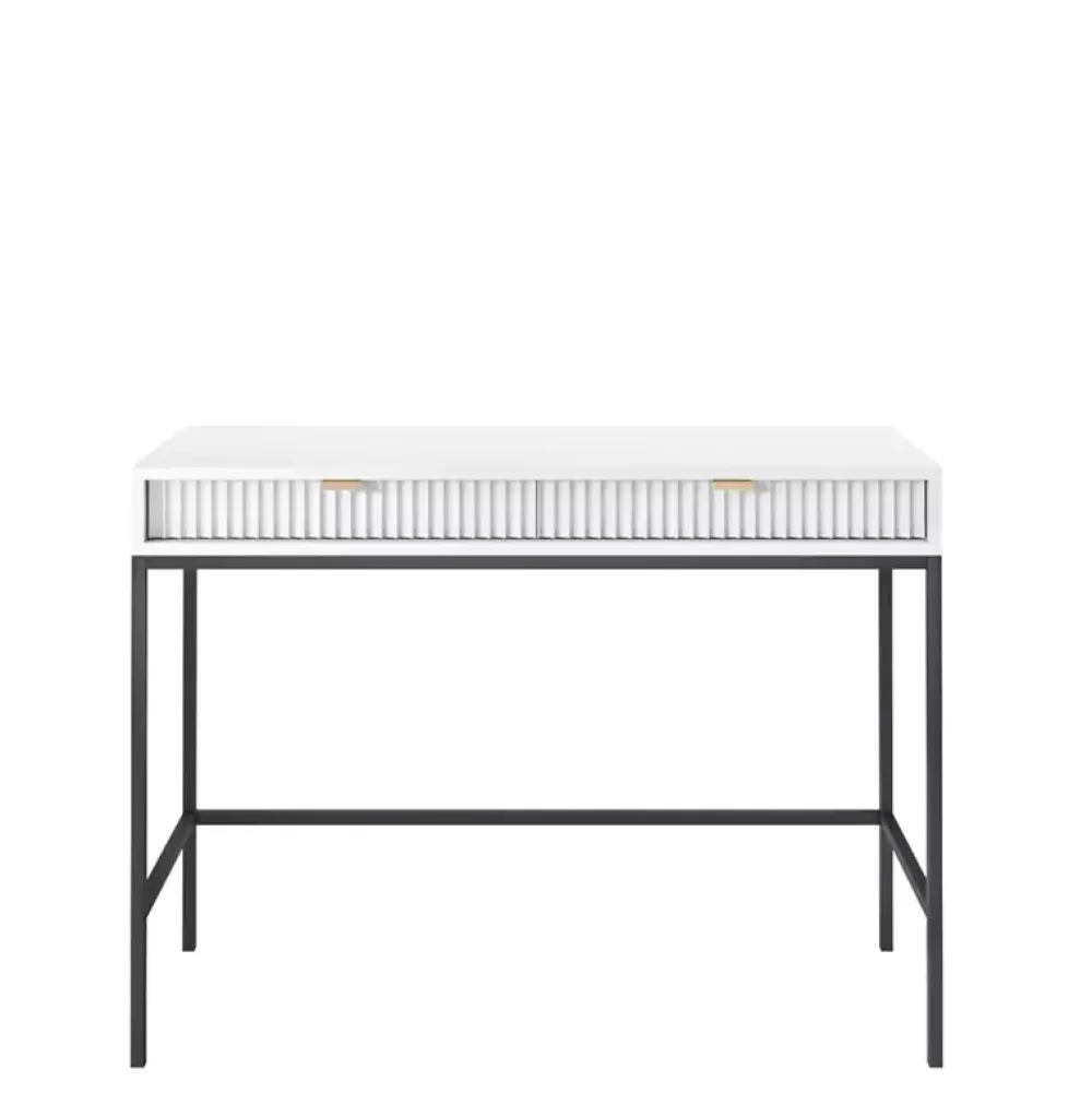- Biała toaletka AVANTI posłuży jako miejsce na kosmetyki lub jako biurko, czy konsola w przedpokoju. Blat o wymiarach 104×50 cm, szuflady z ryflowanymi frontami i złote uchwyty czynią ten mebel praktycznym i funkcjonalnym.