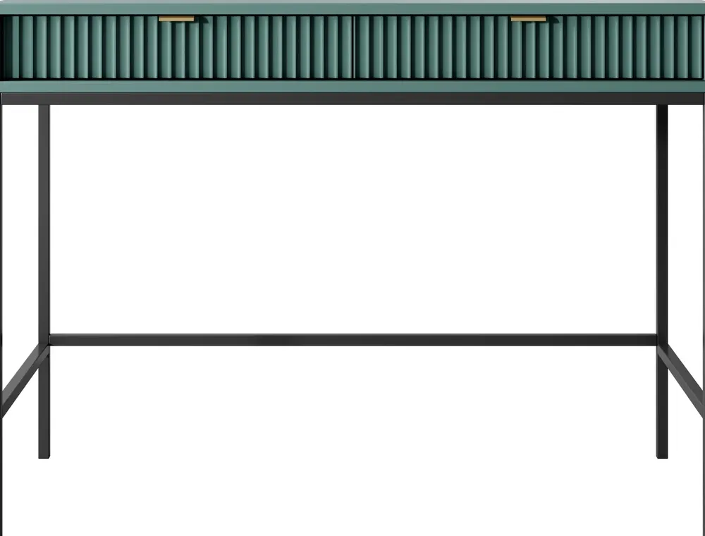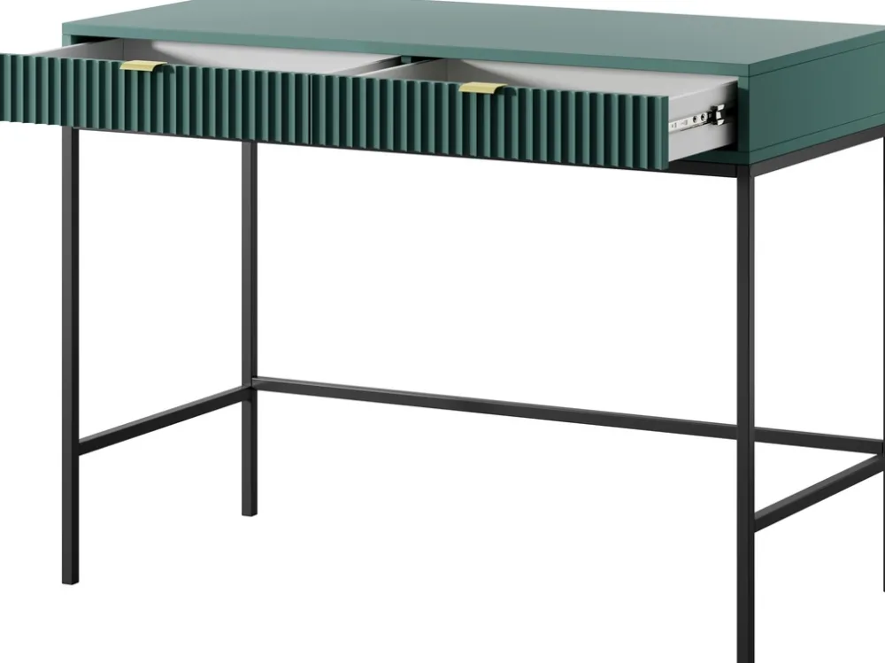 - Toaletka z szufladami AVANTI posiada ryflowany front wykonany z płyty MDF. Nogi toaletki wykonano z solidnego metalu, natomiast aluminiowe uchwyty w kolorze złotym nadają bryle charakteru. Toaletka posiada dwie głębokie szuflady.