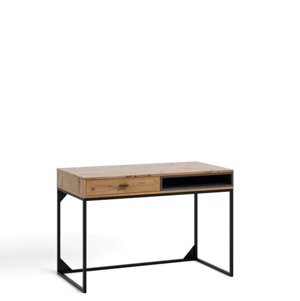 - Biurko na loftowych, metalowych nogach wyposażone w wysuwaną szufladę oraz półkę.