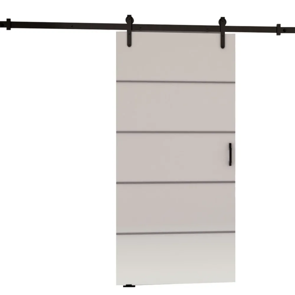 Metalowy system przesuwny, malowany proszkowo, jest synonimem wytrzymałości. Jego ciemna barwa tworzy interesujący kontrast z jasnymi dekoracyjnymi wstawkami, nadając drzwiom surowego, industrialnego charakteru.