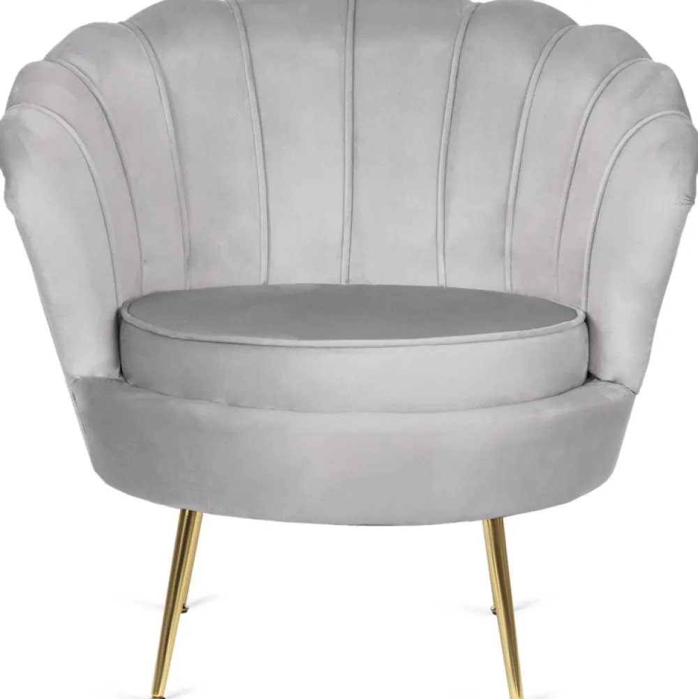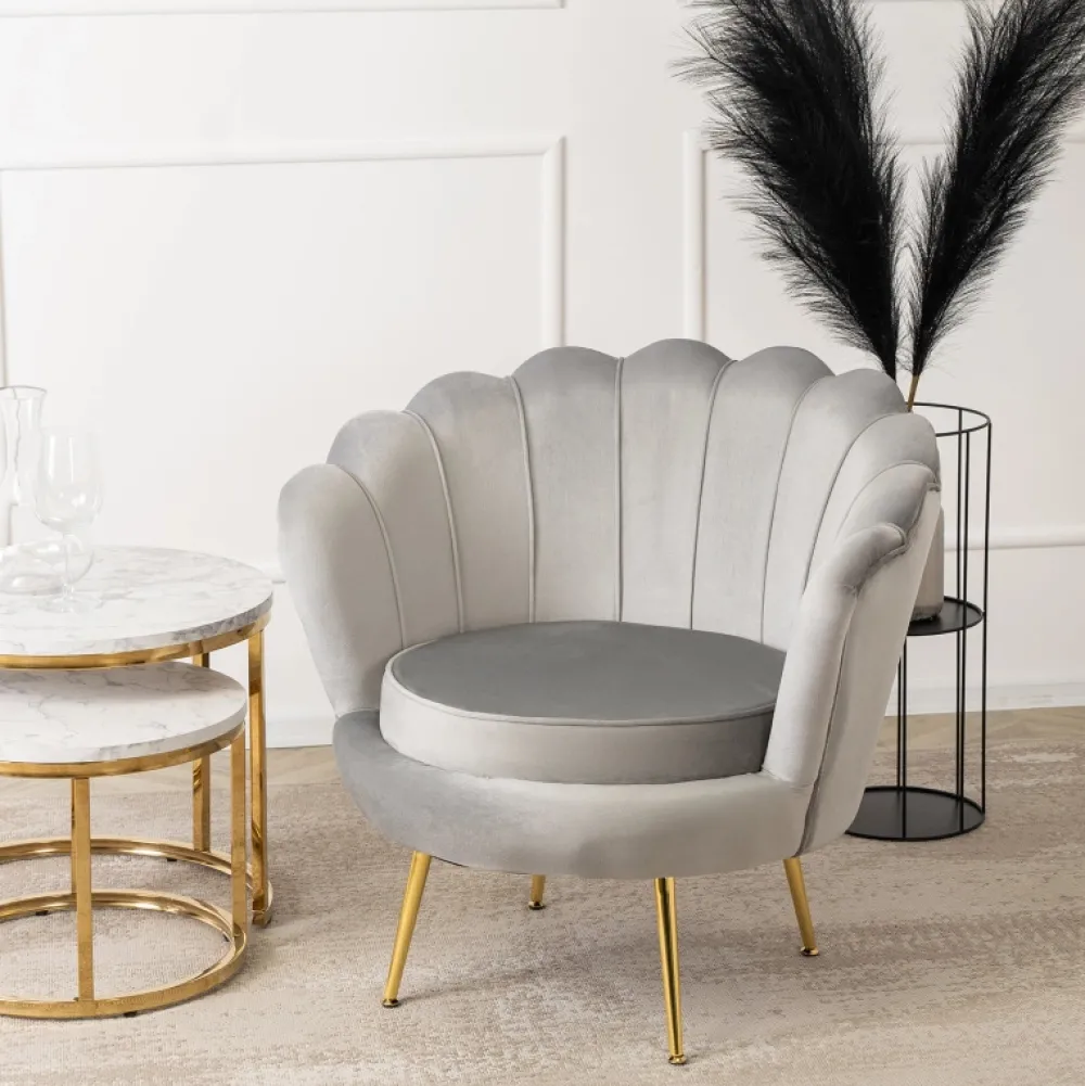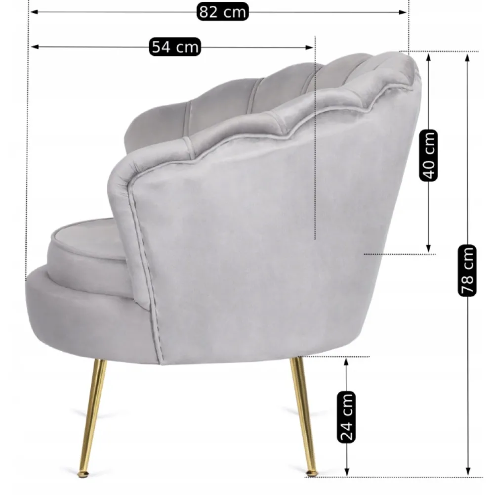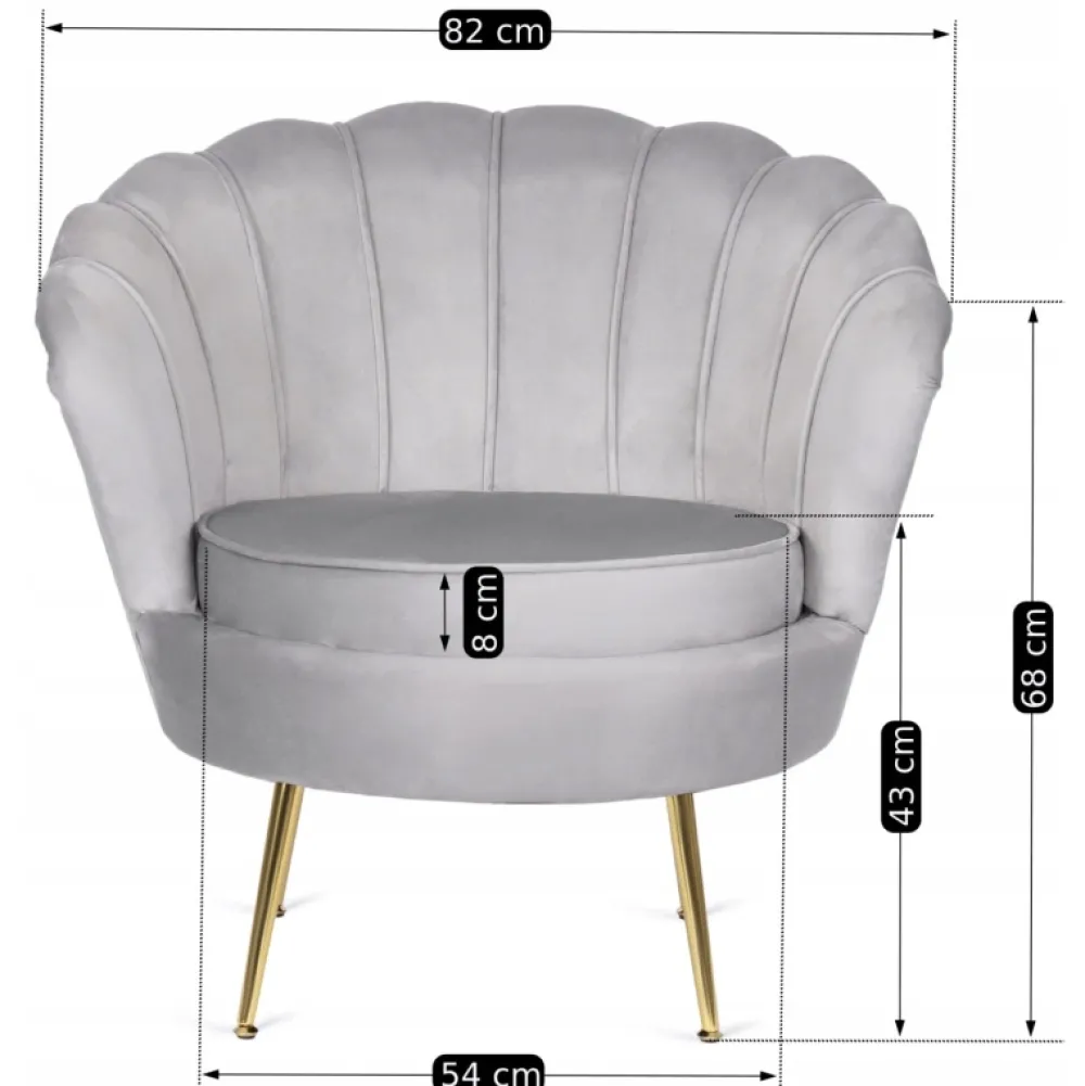 - Fotel ADELLE w eleganckiej szarości to połączenie nowoczesnego designu i komfortu. Miękka tapicerka z weluru, elastyczne wypełnienie i złota metalowa podstawa tworzą harmonijną całość, idealną do salonu, sypialni czy biura. Stabilność i estetyka w jednym.