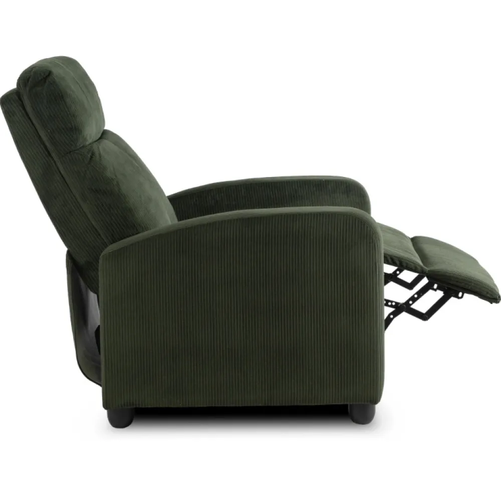 - Fotel DUMIO w zielonej tapicerce sztruksowej to połączenie komfortu i nowoczesnego designu. Funkcja rozkładania, 3-stopniowa regulacja oparcia oraz podnóżek zapewniają wygodę. Stabilna metalowa konstrukcja i zielony kolor wprowadzą świeżość do wnętrza.