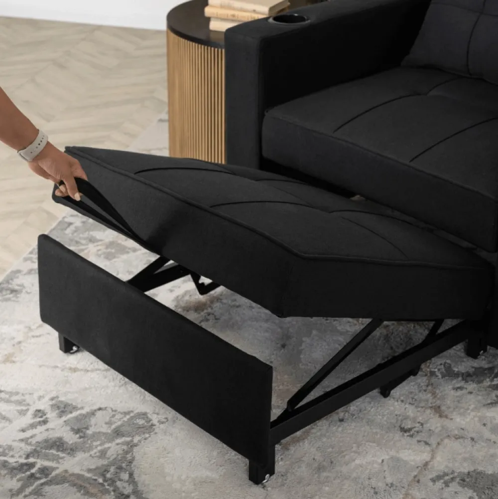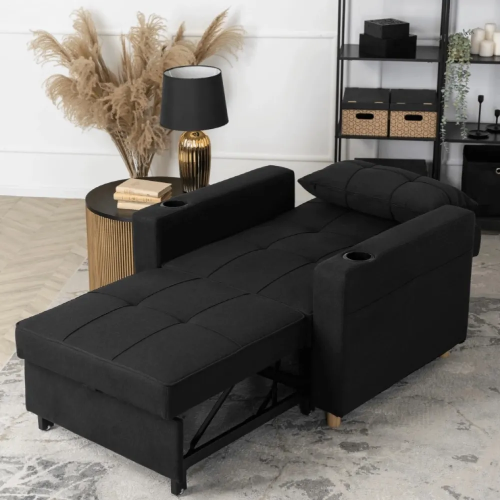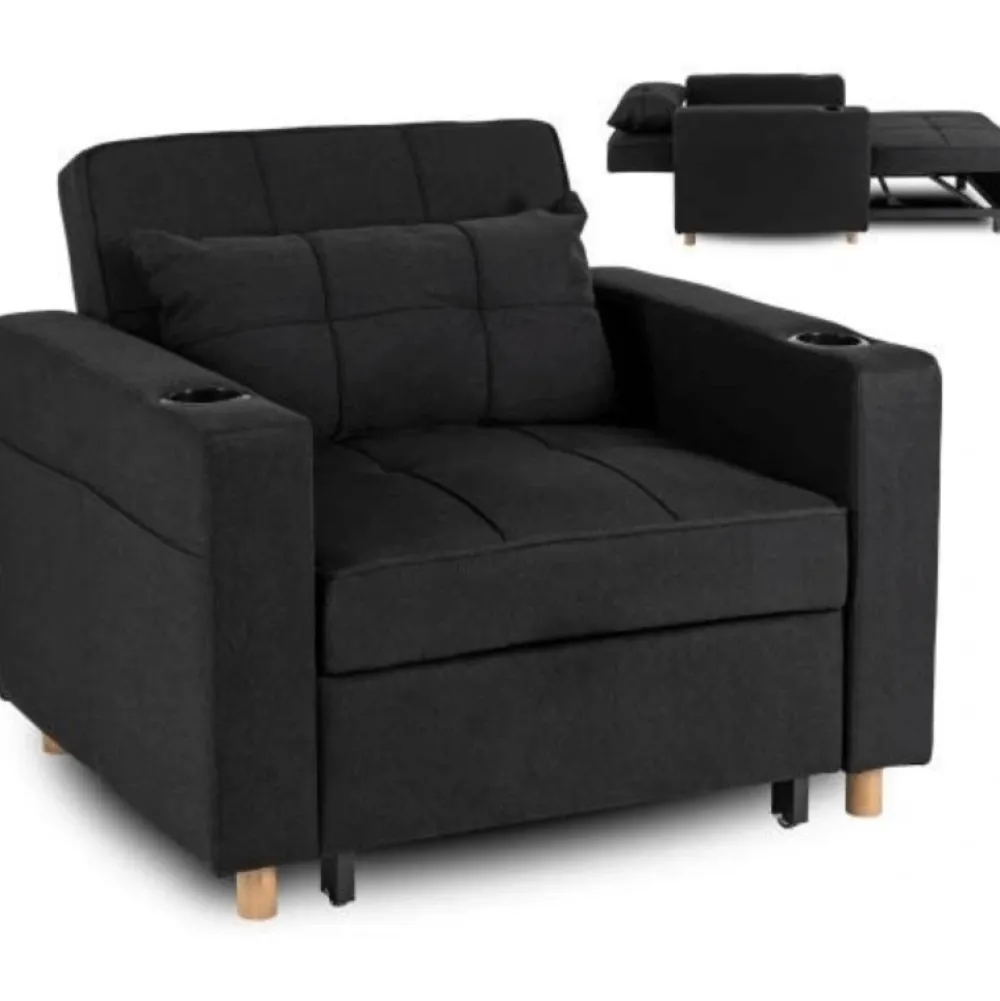 - Fotel rozkładany SOREL w kolorze czarnym łączy funkcjonalność i komfort. Z funkcją spania (72×186 cm), trzema poziomami rozkładania, podnóżkiem, podłokietnikami i wbudowanymi wkładkami na napoje. Tapicerka łatwa w czyszczeniu, metalowy korpus.