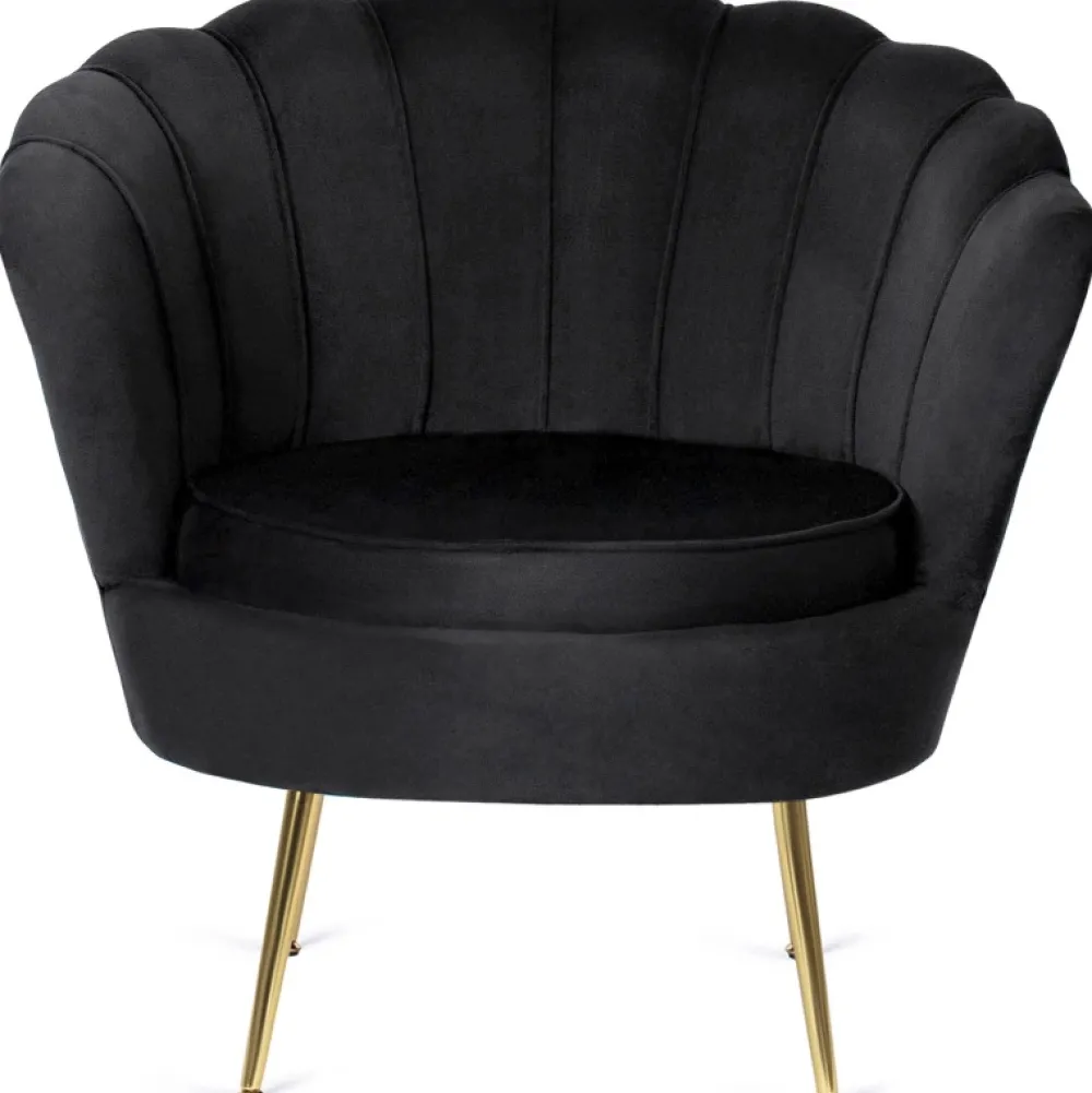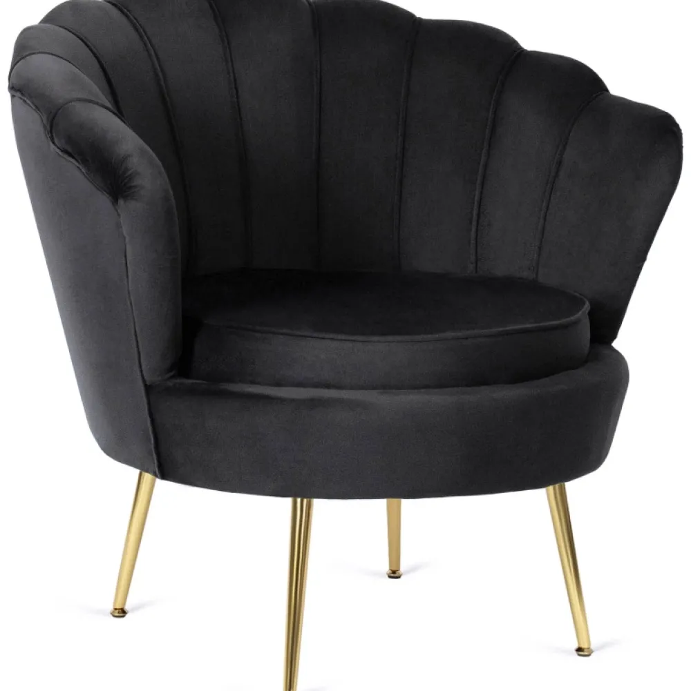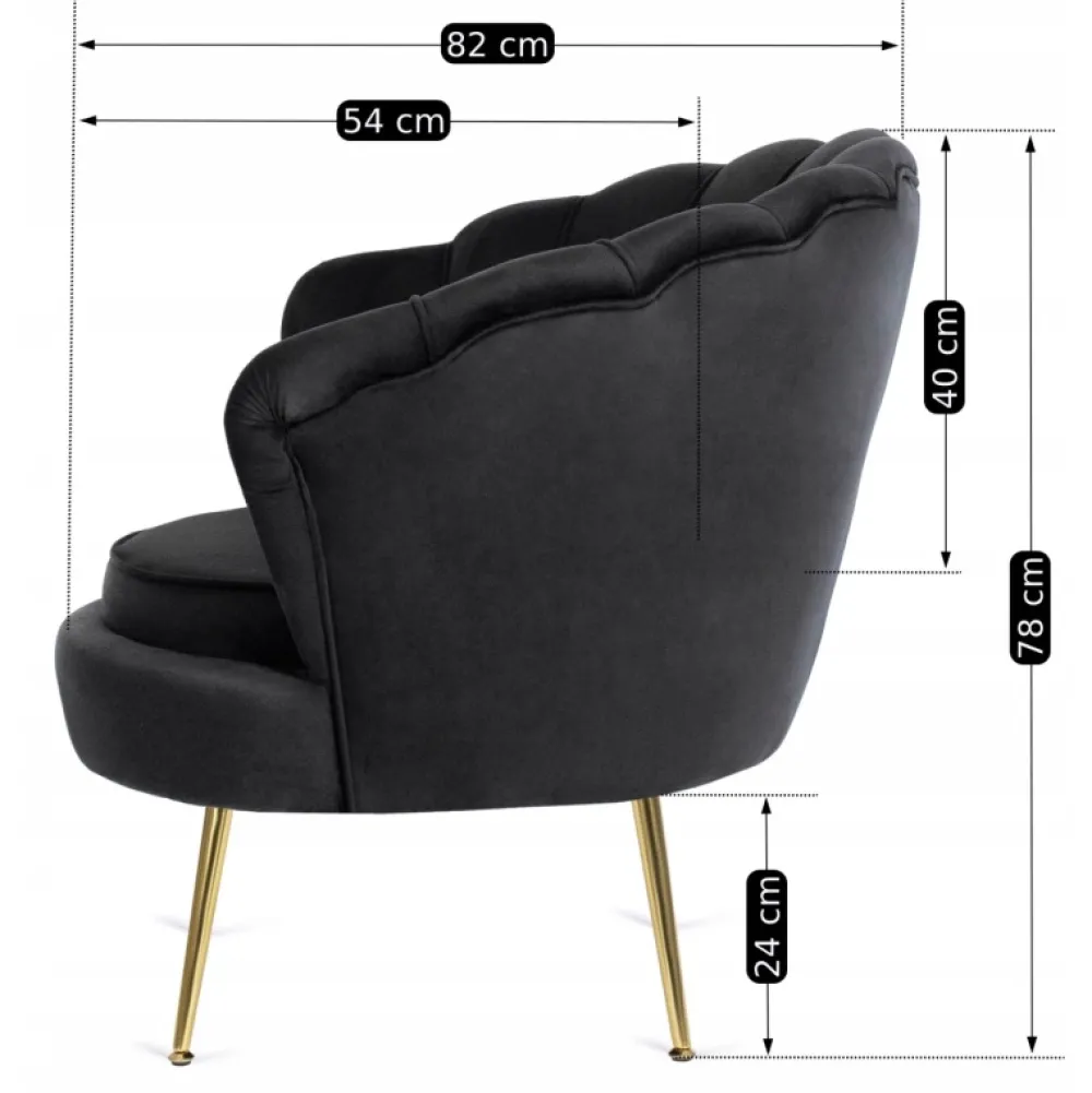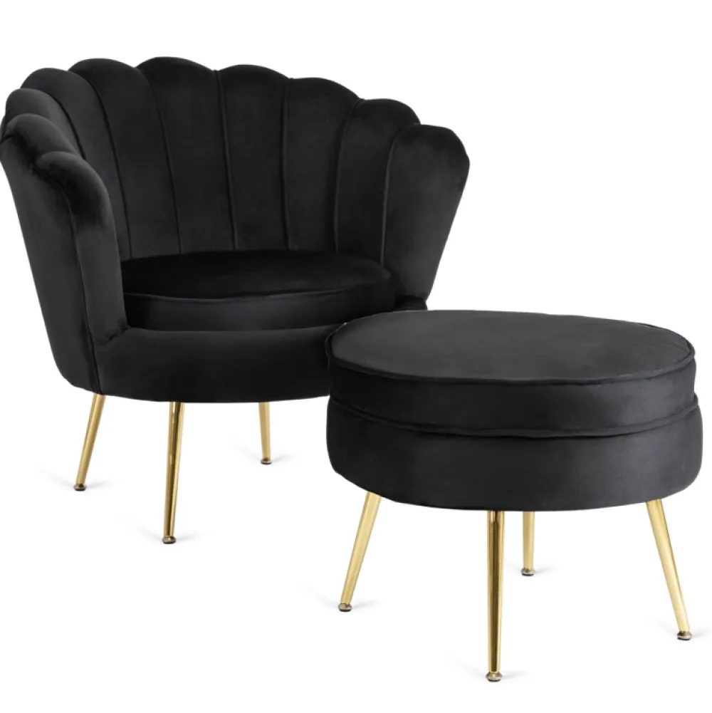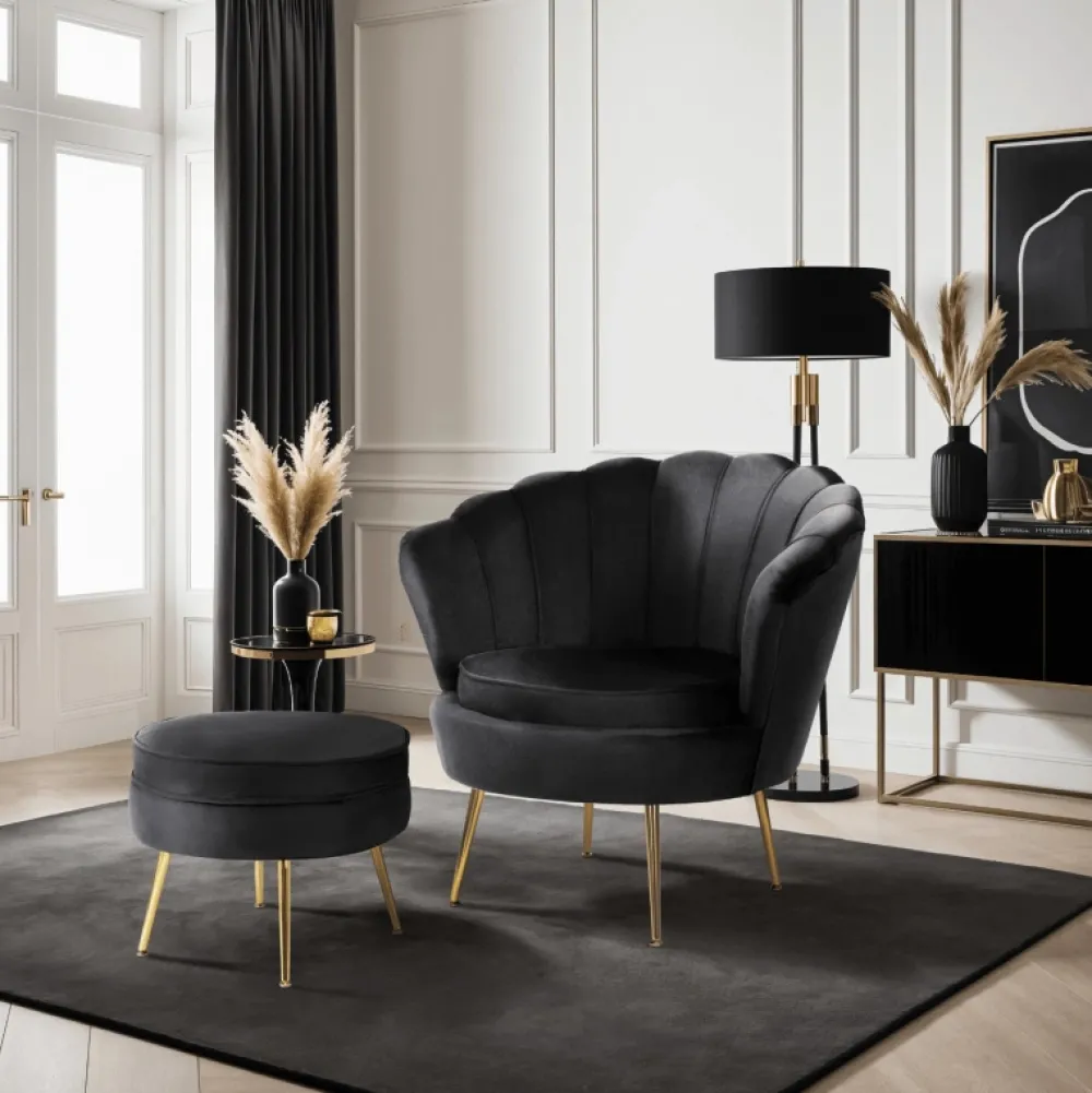Fotel wypoczynkowy z podnóżkiem GISANO w czarnej, welurowej tapicerce to połączenie luksusu i wygody, które odmieni każdą przestrzeń. Inspirowany formą muszli, przyciąga uwagę dekoracyjnymi przeszyciami i złotymi detalami. To mebel stworzony z myślą o codziennym komforcie – idealny do salonu, sypialni, a nawet garderoby.