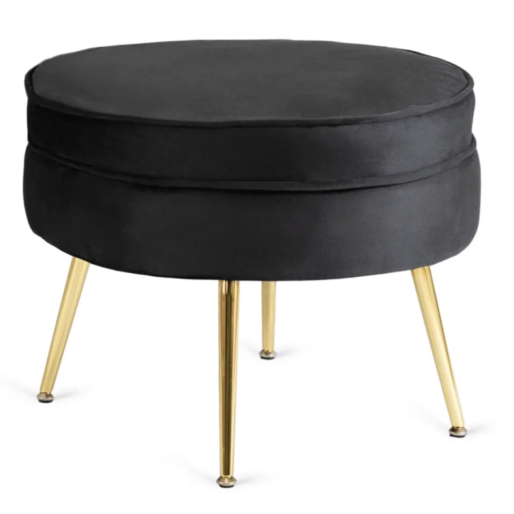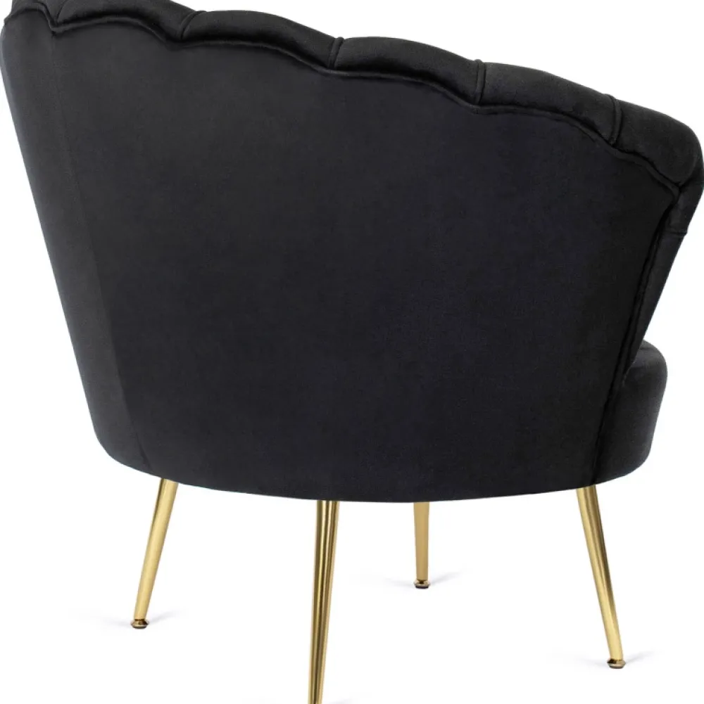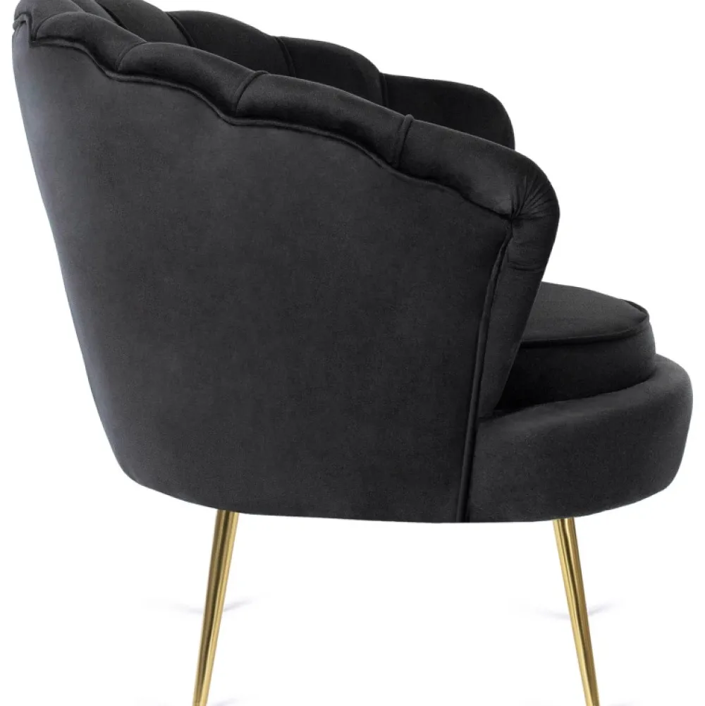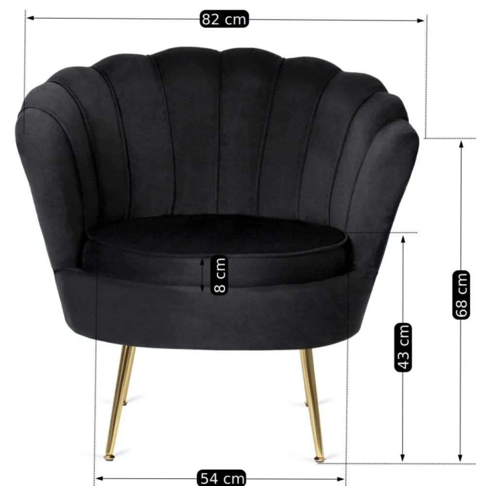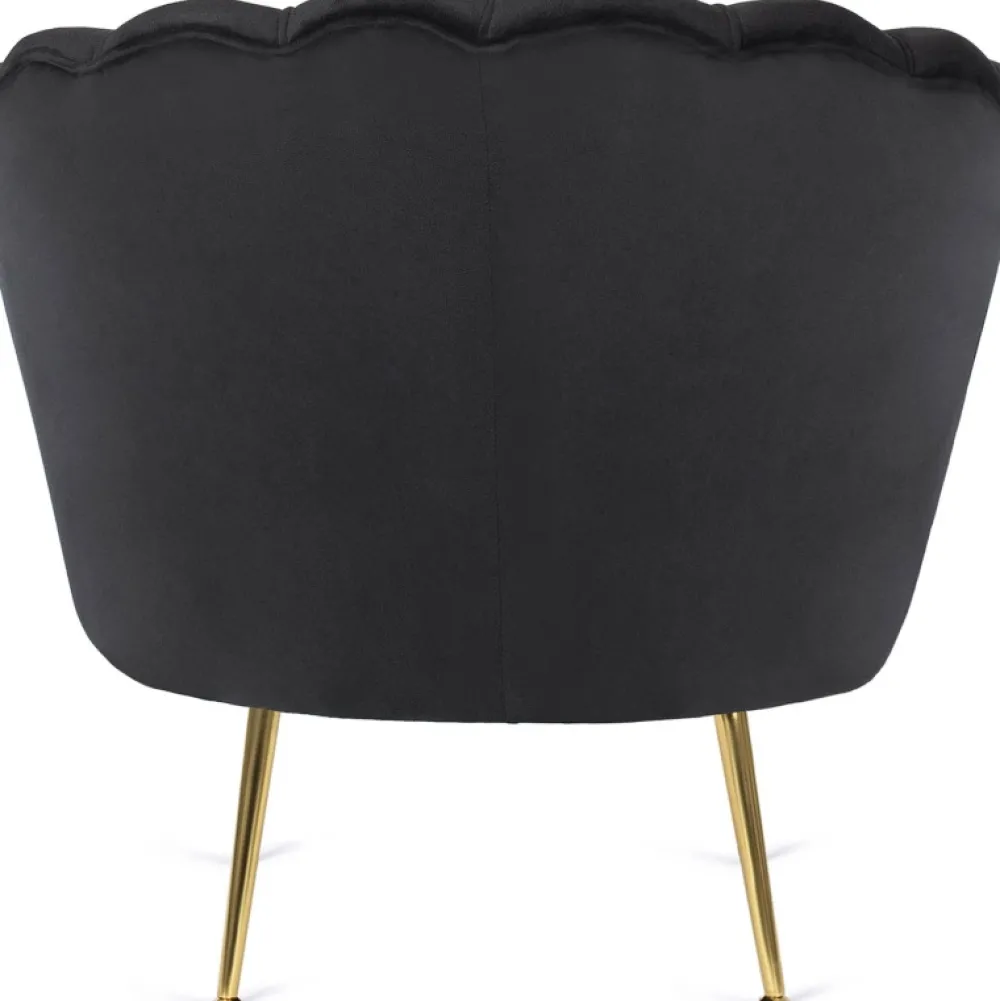 - Czarny fotel GISANO z weluru i podnóżkiem to idealny wybór do salonu lub sypialni. Styl glamour, złote nogi i dekoracyjne przeszycia łączą luksus z wygodą, tworząc elegancką przestrzeń do codziennego relaksu.