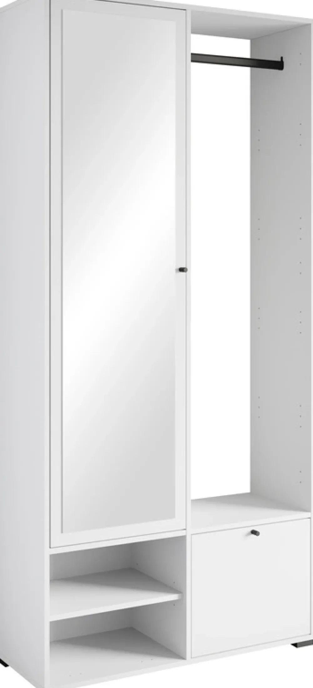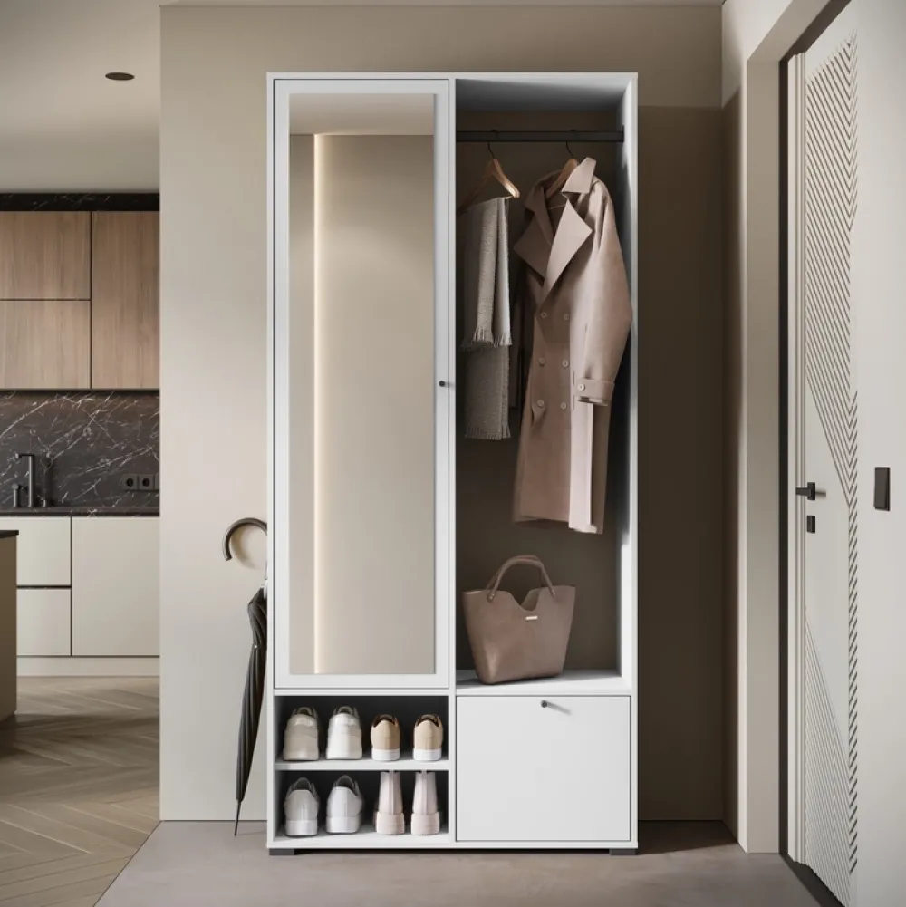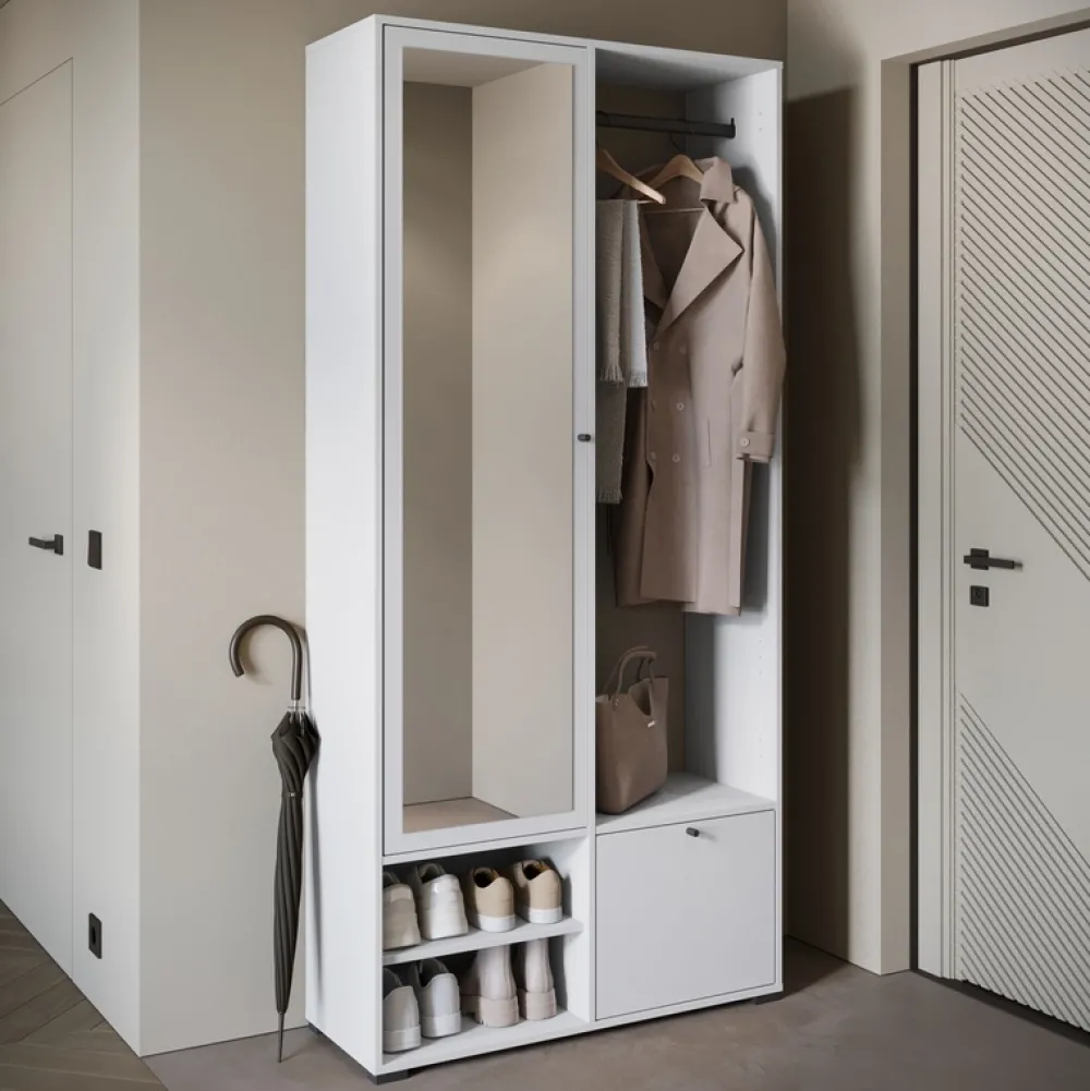 Garderoba do przedpokoju oferuje wszystko, czego potrzebujesz do wygodnego przechowywania. Drzwi z lustrem optycznie powiększają przestrzeń i pozwalają na szybkie sprawdzenie stylizacji przed wyjściem. Otwarta przestrzeń na dole z dwiema półkami to idealne miejsce na buty codziennego użytku, a zamykana szafka zapewnia dodatkową przestrzeń na pozostałe pary. Praktyczny wieszak na drążku umożliwia wygodne odwieszanie kurtek i płaszczy.