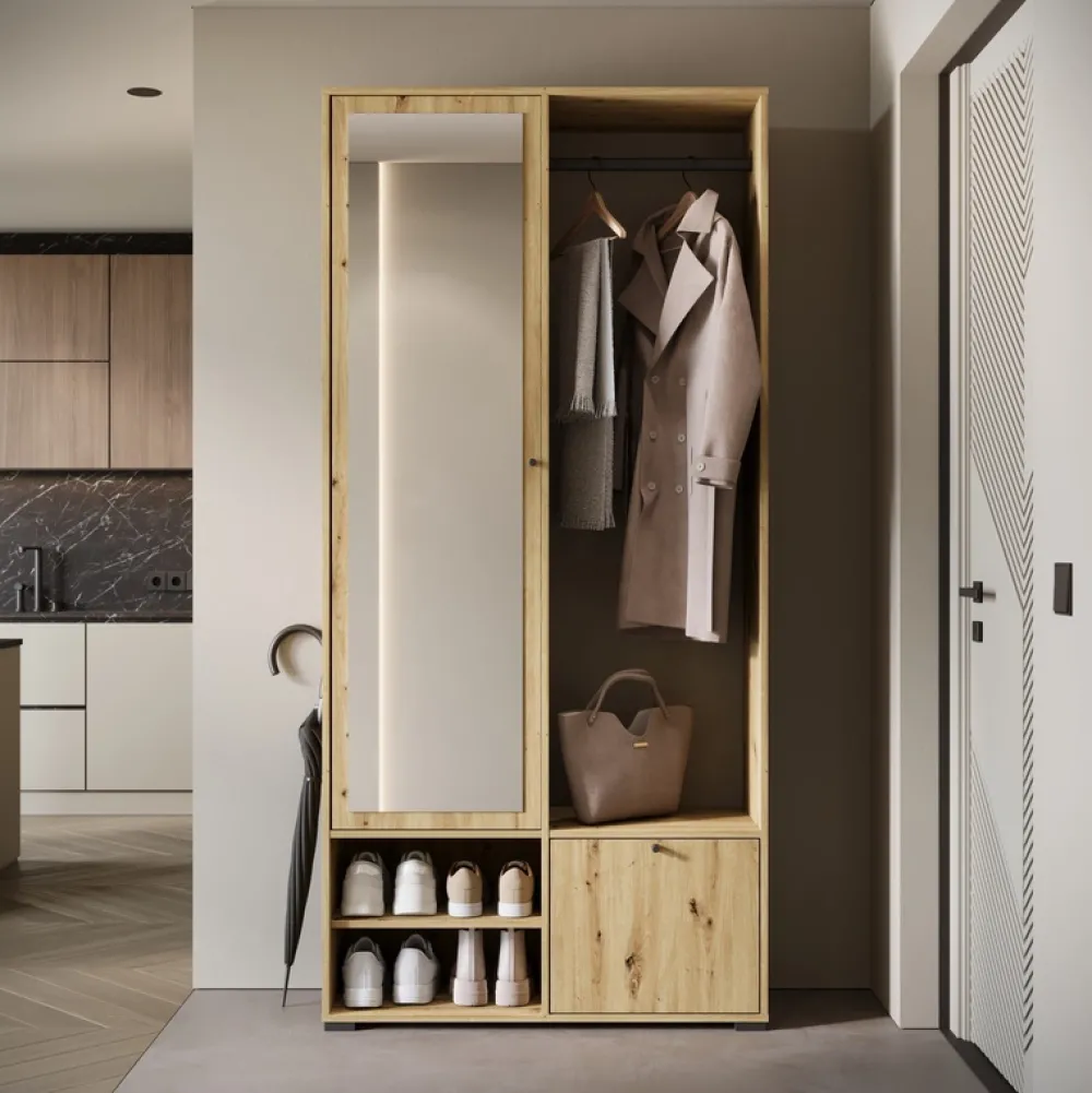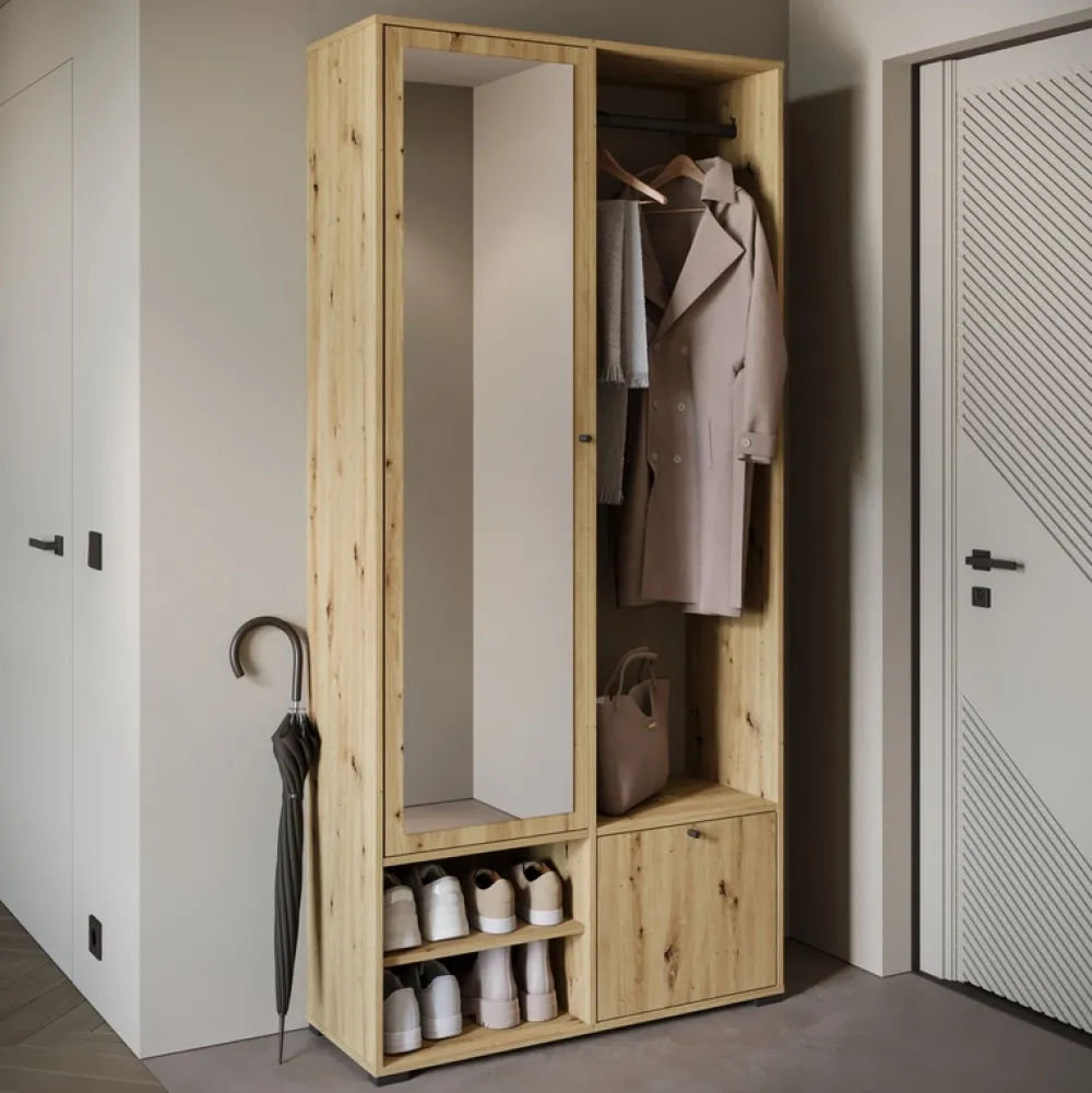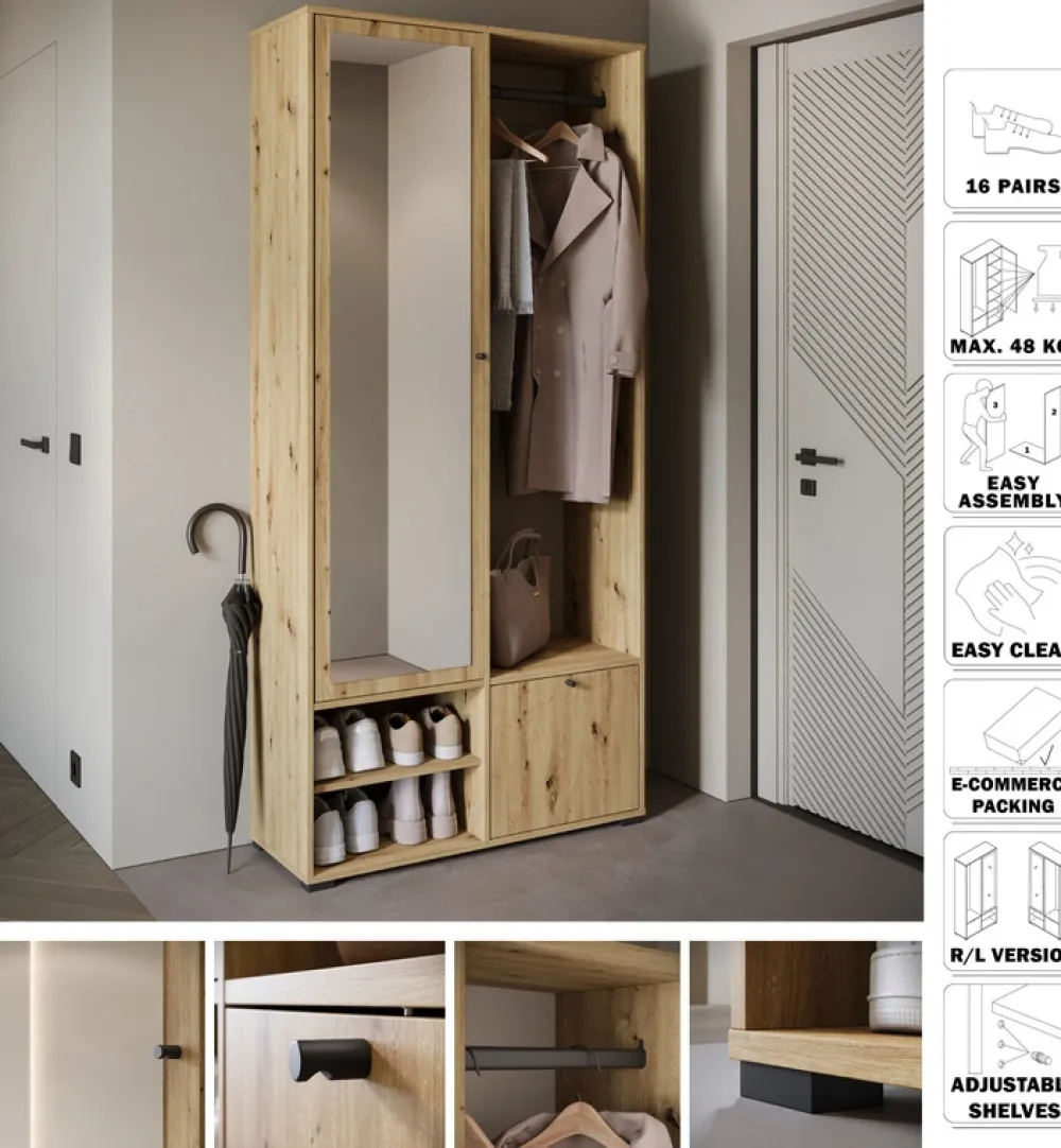 Garderoba do przedpokoju oferuje wszystko, czego potrzebujesz do wygodnego przechowywania. Drzwi z lustrem optycznie powiększają przestrzeń i pozwalają na szybkie sprawdzenie stylizacji przed wyjściem. Otwarta przestrzeń na dole z dwiema półkami to idealne miejsce na buty codziennego użytku, a zamykana szafka zapewnia dodatkową przestrzeń na pozostałe pary. Praktyczny wieszak na drążku umożliwia wygodne odwieszanie kurtek i płaszczy.