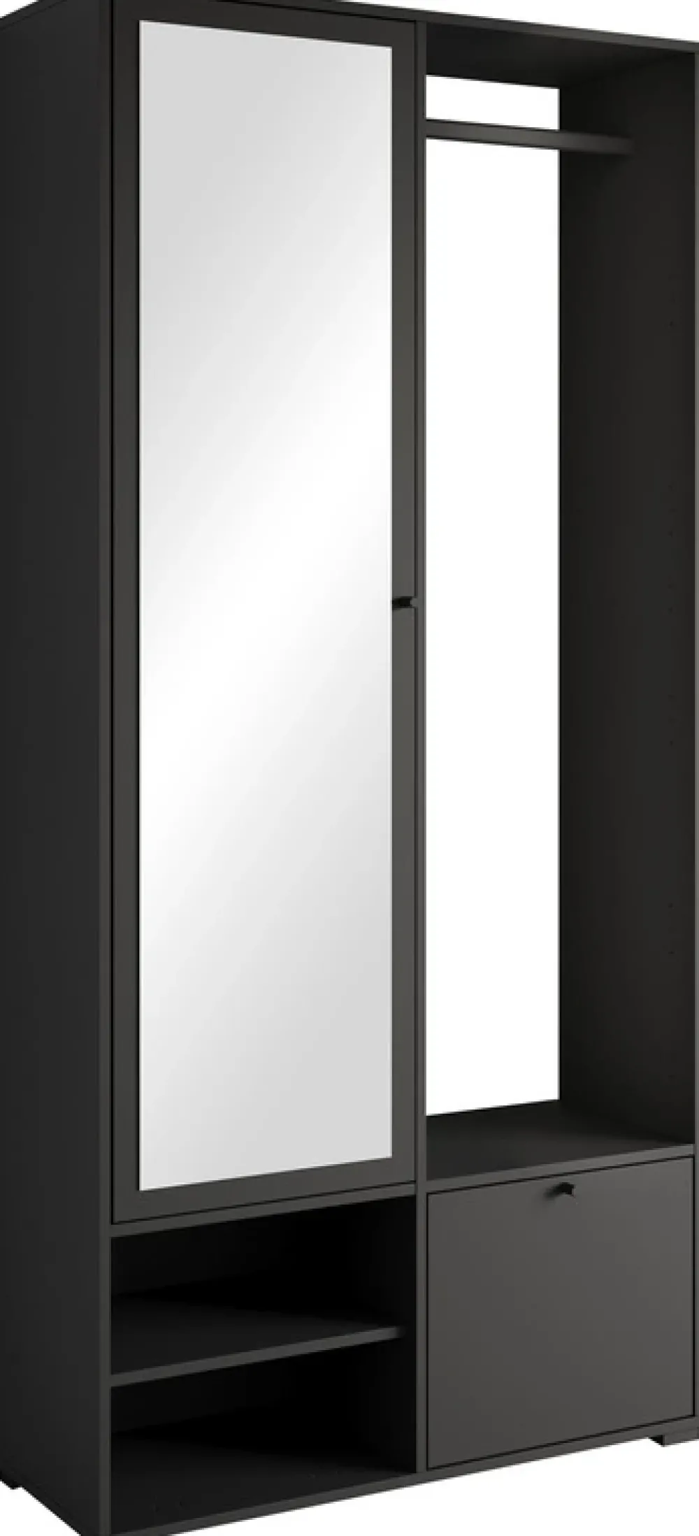 Garderoba do przedpokoju oferuje wszystko, czego potrzebujesz do wygodnego przechowywania. Drzwi z lustrem optycznie powiększają przestrzeń i pozwalają na szybkie sprawdzenie stylizacji przed wyjściem. Otwarta przestrzeń na dole z dwiema półkami to idealne miejsce na buty codziennego użytku, a zamykana szafka zapewnia dodatkową przestrzeń na pozostałe pary. Praktyczny wieszak na drążku umożliwia wygodne odwieszanie kurtek i płaszczy.
