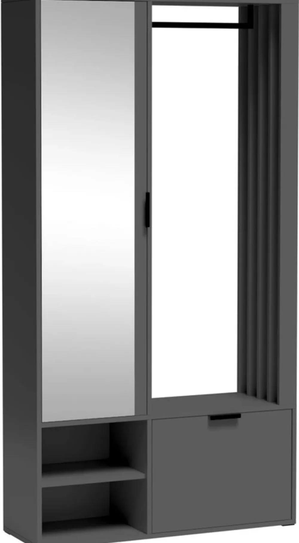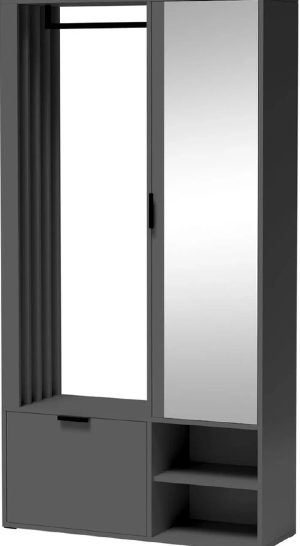 - Garderoba do przedpokoju z lustrem MORTIS została wykonana z płyty laminowanej 16 mm. Obrzeża garderoby estetycznie wykończono okleiną PCV. Garderoba charakteryzuje się ponadczasowym wyglądem, szafką uchylną i drzwiami, za którymi znajdują się półki.