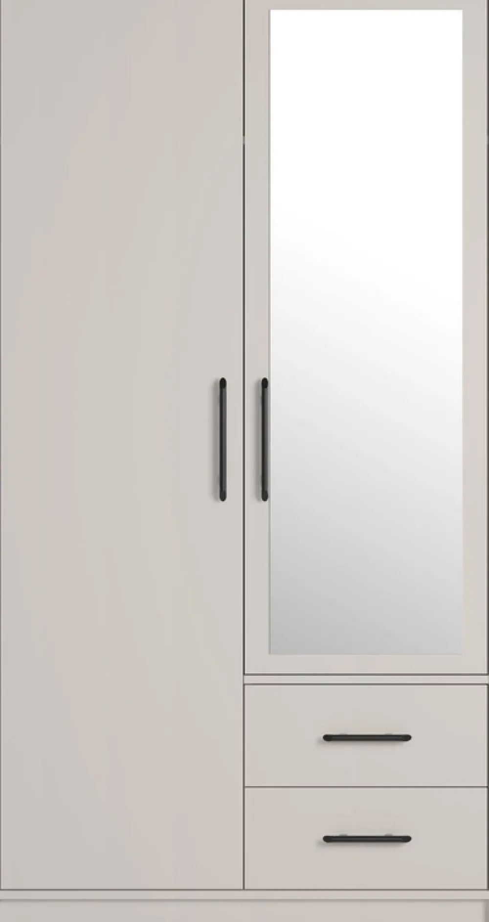- Szafa dwudrzwiowa KASZMIR z lustrem 100 cm – kompaktowa, a pojemna. Z drążkiem, dwiema szufladami i lustrem na froncie. Elegancki kolor kaszmir rozjaśnia wnętrze i dodaje klasy. Idealna do sypialni lub przedpokoju w nowoczesnym stylu.