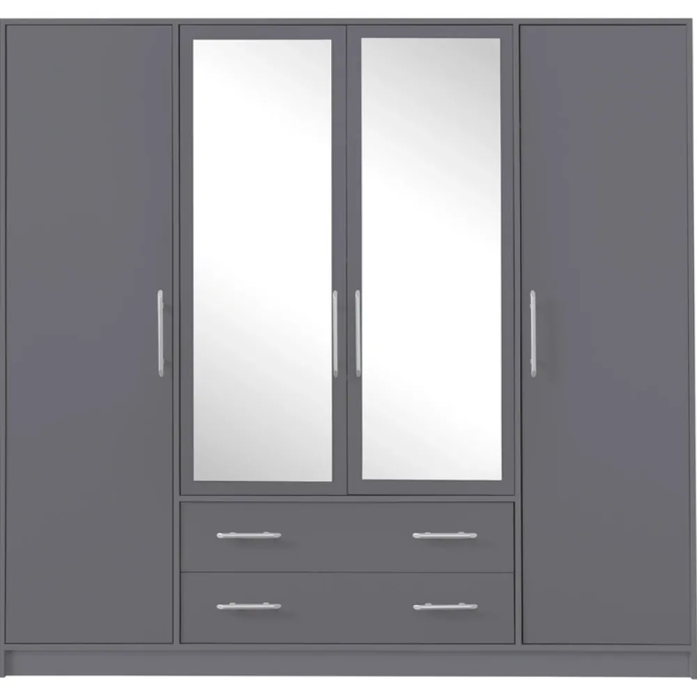 - Szafa SEVAS została wyposażona w czworo drzwi uchylnych, za którymi skrywają się liczne półki oraz dwa drążki na wieszaki. Szafa została wzbogacona o drzwi z lustrem, pod którymi znajdują się dwie pojemne szuflady osadzone na prowadnicach rolkowych.