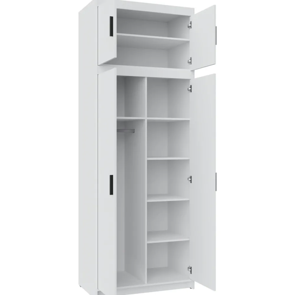 - Szafa z nadstawką KUBA 89 cm w kolorze białym. Szafa z półkami i drążkiem + nadstawka z półką. Matowe wykończenie, czarne uchwyty, 15 mm laminat. Praktyczne i eleganckie przechowywanie w kompaktowej formie. Idealna do garderoby lub przedpokoju.