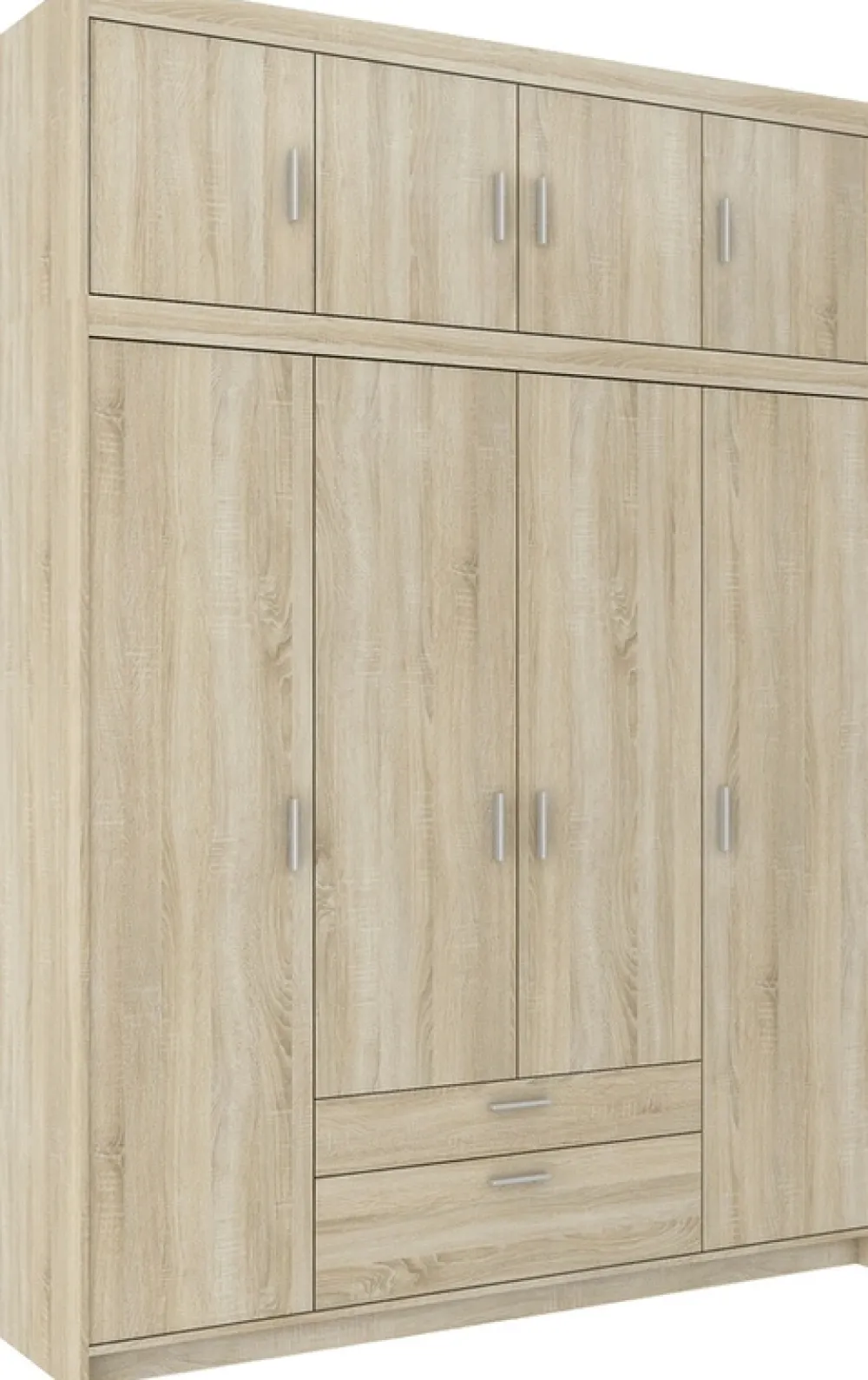 - Szafa KUBA dąb sonoma z nadstawką to połączenie jasnej elegancji i funkcjonalności. Cztery drzwi, półki, szuflady i drążki zapewniają doskonałą organizację. Nadstawka z 3 komorami zwiększa pojemność. Srebrne uchwyty i matowe wykończenie.