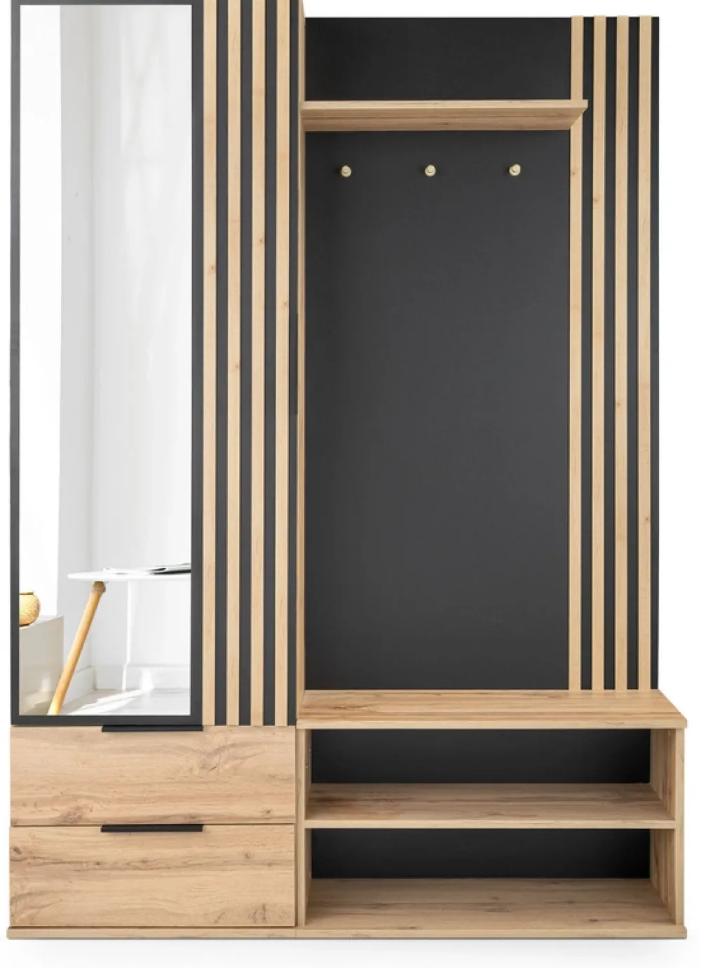 - Garderoba z lustrem i lamelami 140 cm LAVO to świetna propozycja na wyposażenie przedpokoju. U dołu znajdują się dwie pojemne szuflady. Za drzwiami znajduje się metalowy uchwyt na wieszaki i półka. Garderoba w połączeniu koloru dąb wotan i czarnego.