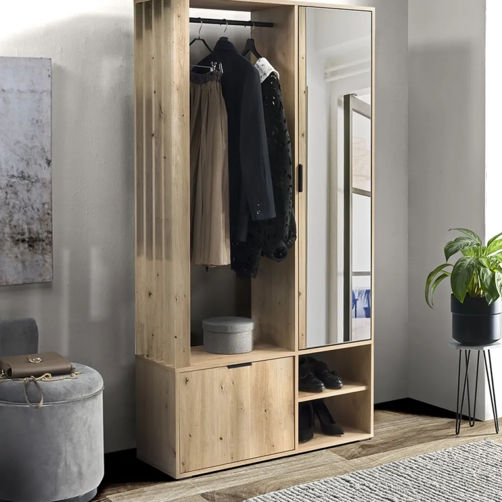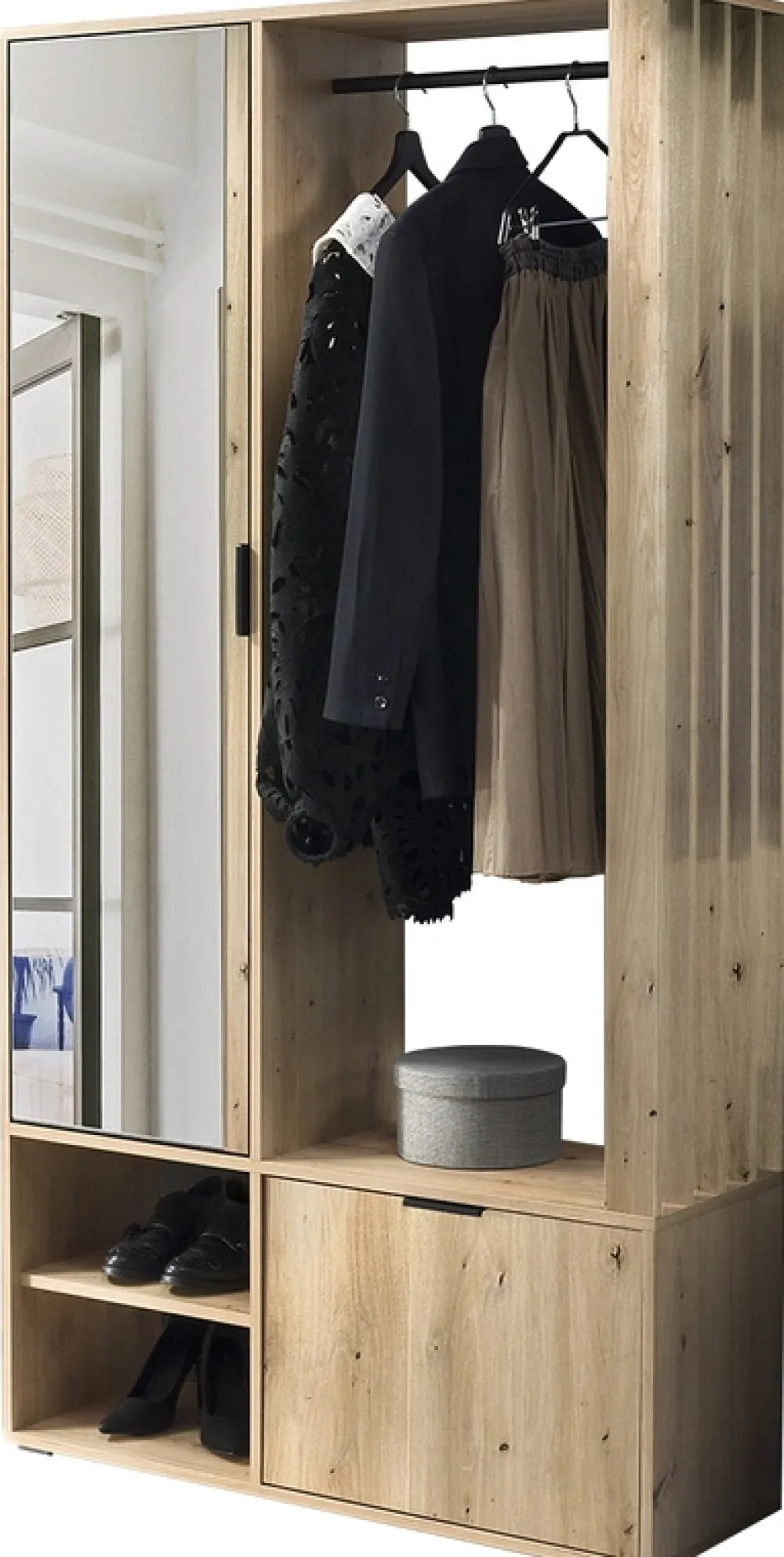 - Garderoba do przedpokoju z lustrem MORTIS została wykonana z płyty laminowanej 16 mm. Obrzeża garderoby estetycznie wykończono okleiną PCV. Garderoba charakteryzuje się ponadczasowym wyglądem, szafką uchylną i drzwiami, za którymi znajdują się półki.