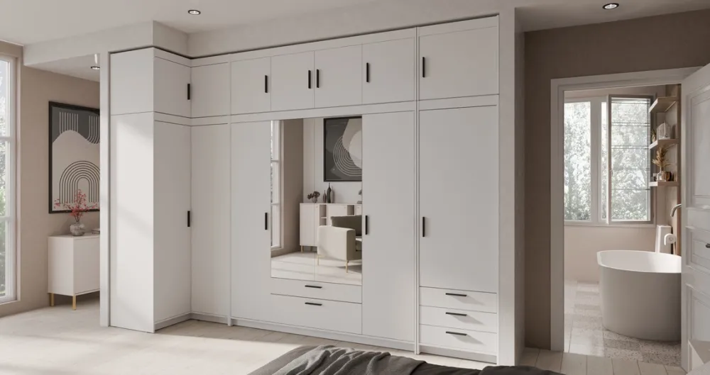 Szafa modułowa KUBA – nowoczesna zabudowa w białym macie z lustrzanym wykończeniem