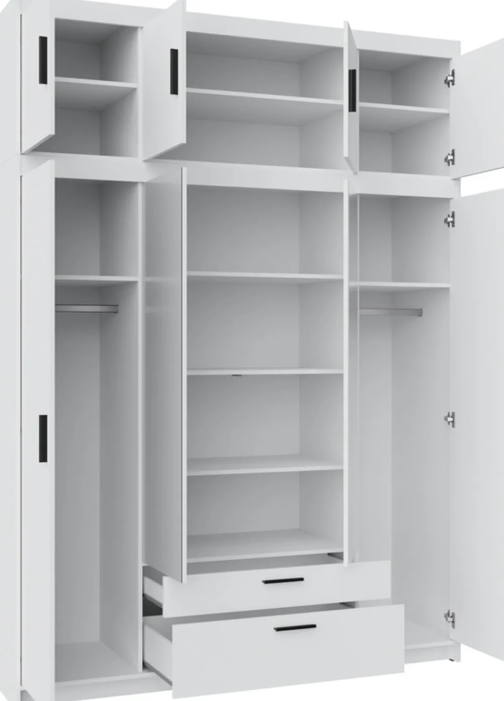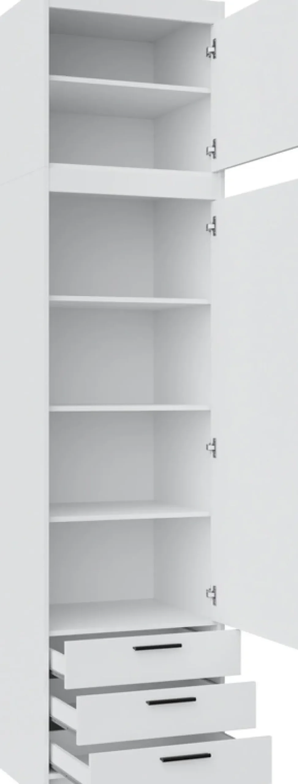 - System szaf KUBA to funkcjonalna i elegancka zabudowa w białym macie. Modułowe szafy i nadstawki pozwalają stworzyć idealną przestrzeń do przechowywania. Czarne uchwyty, półki, drążki i szuflady zapewniają wygodę, a całość optycznie powiększa wnętrze.