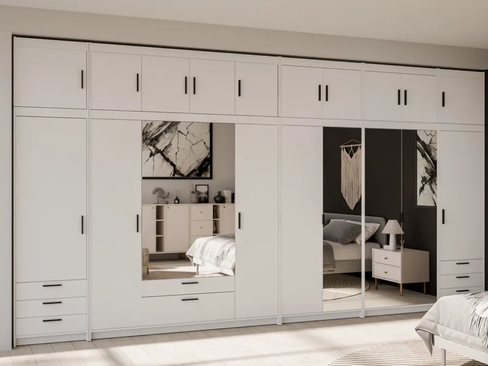 Szafa modułowa KUBA – nowoczesna zabudowa w białym macie z lustrzanym wykończeniem